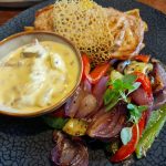 Piri pirijautienos gabaliukai, batatų kremas,marinuoti svogūnai ir agurkų salsa – 14,00€
