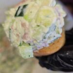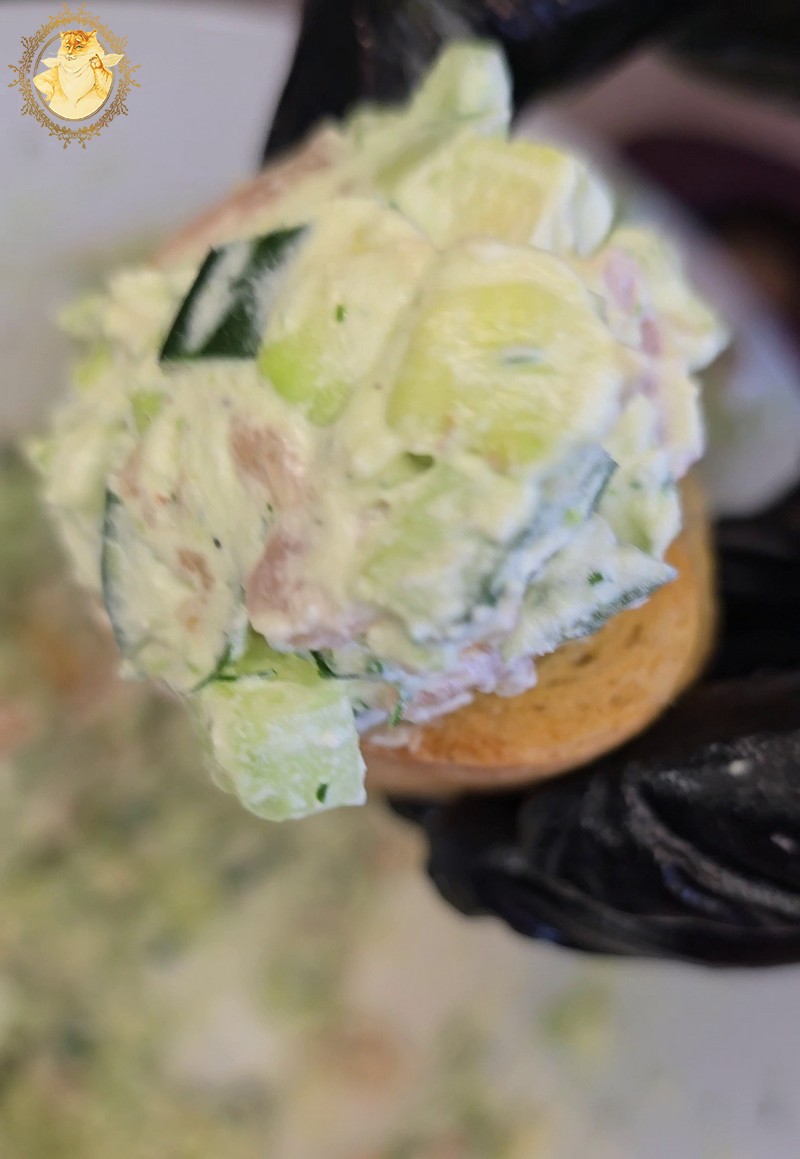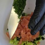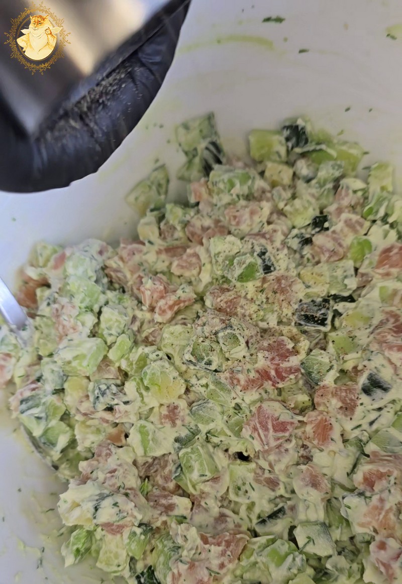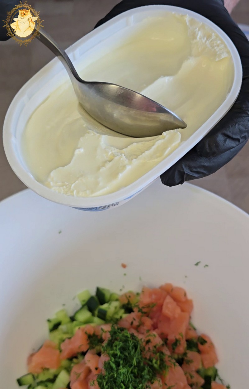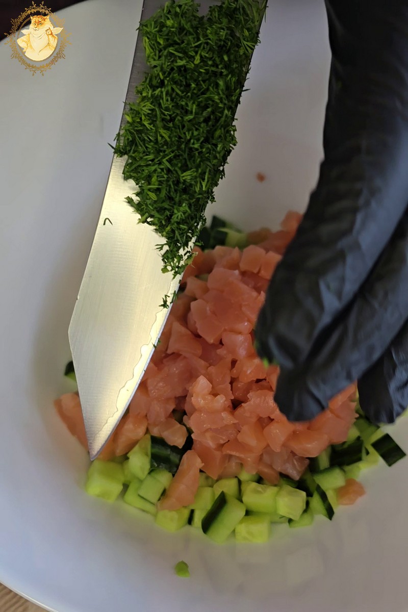 Supjaustome avokadą, agurką, lašišą, krapus, įdedame tepamo sūrio, pipirų ir viską gerai išmaišome.