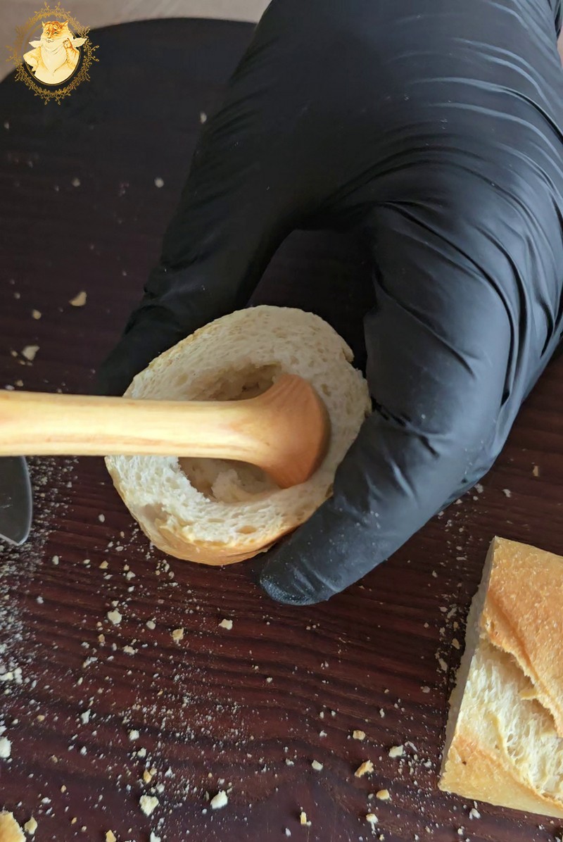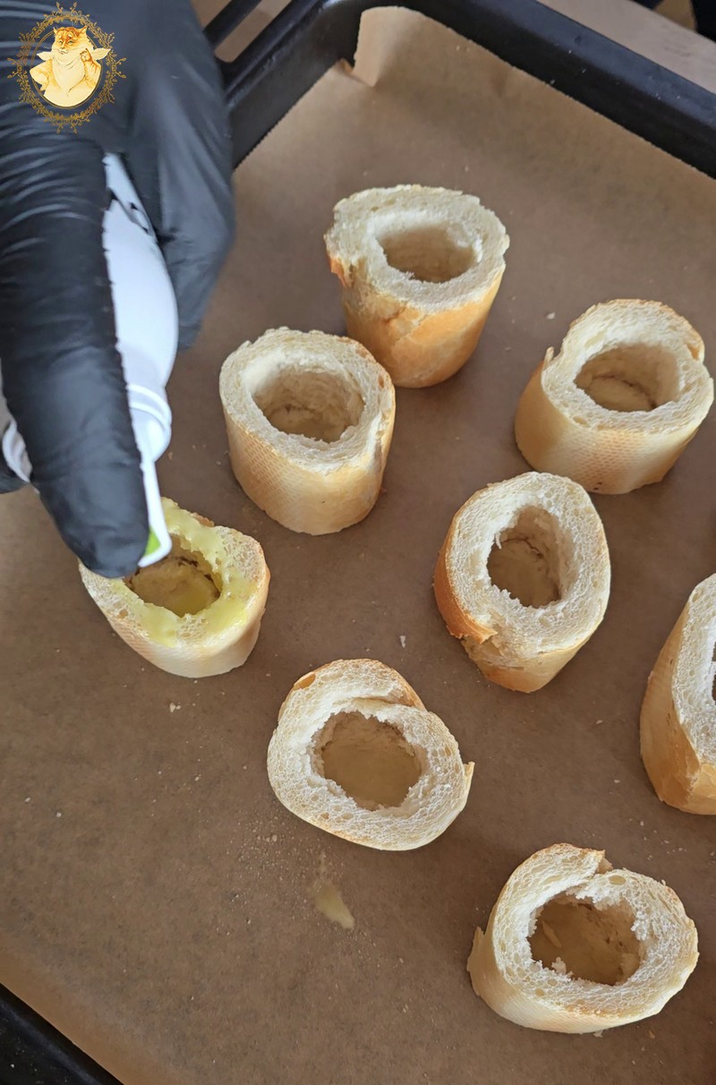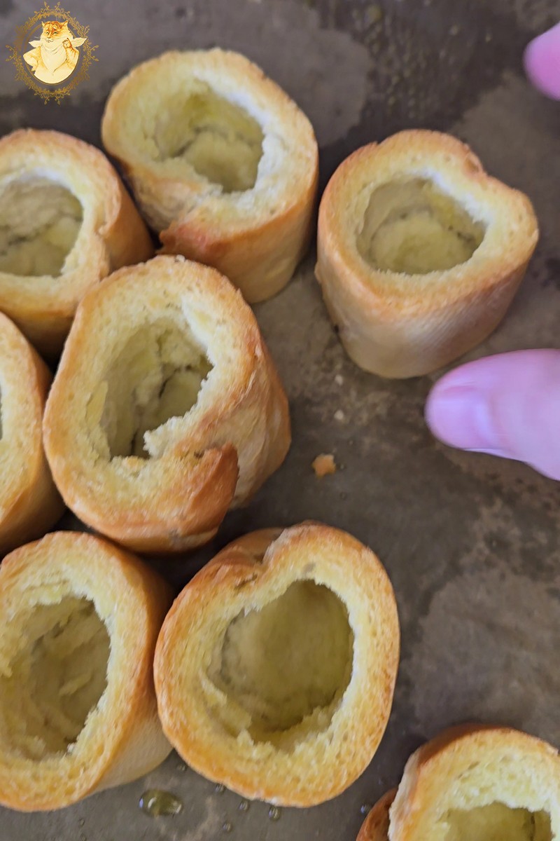 Pirmiausia supjaustę batoną 3 cm. kubeliais, jų viduje padarykime įdubas, kurias išpurškę aliejumi pašaukime į orkaitę įkaitintą iki 180 C ir kepkime kol jie gražiai apskrus.