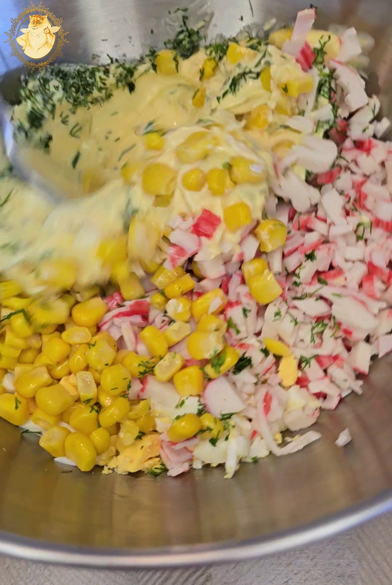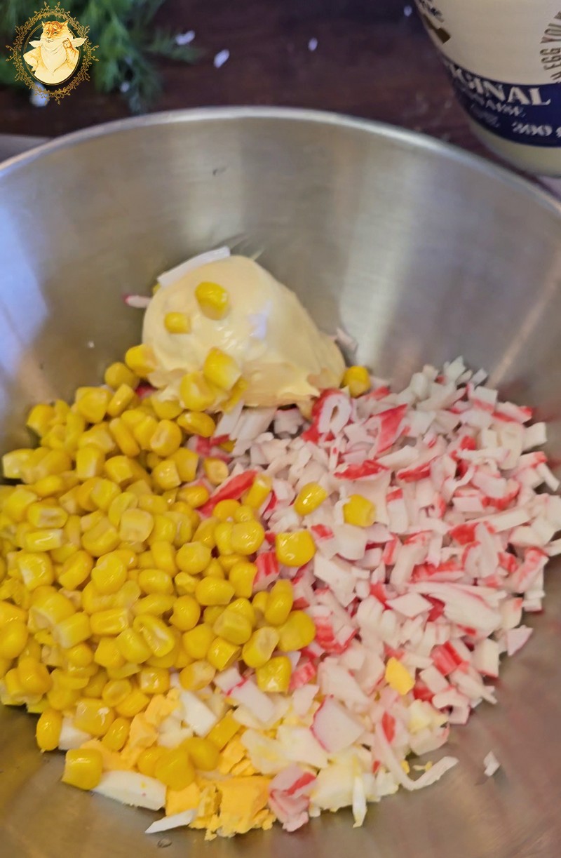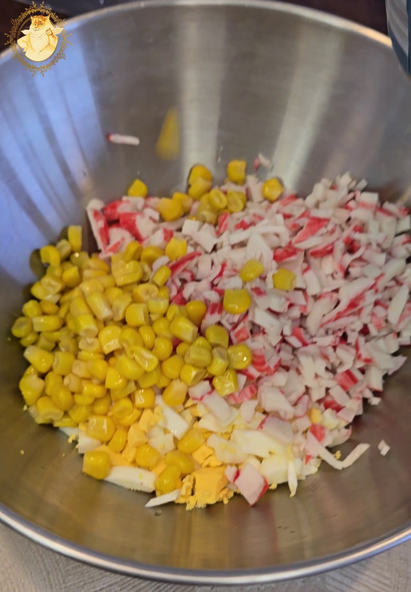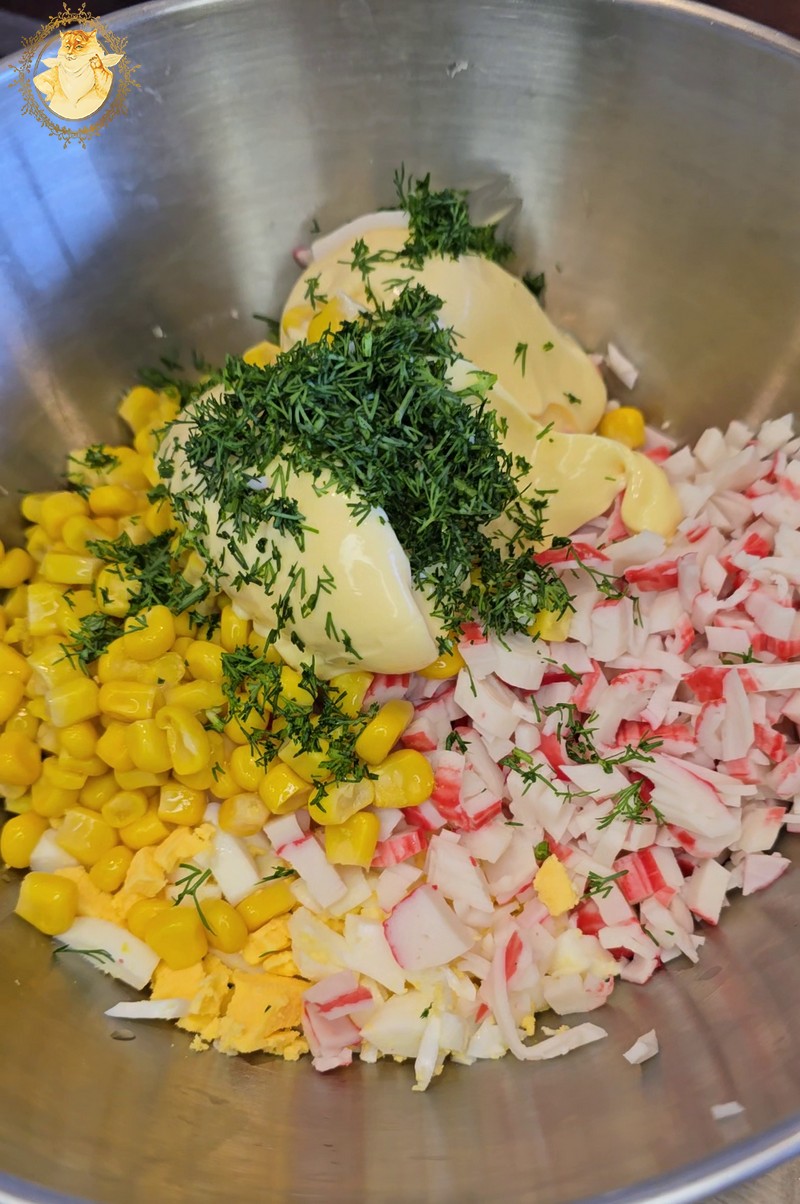 Supjaustome krabų skonio lazdeles, kiaušinius, sudedame į indą kukurūzus, įdedame majonezo, smulkintų krapų ir pipirų.