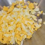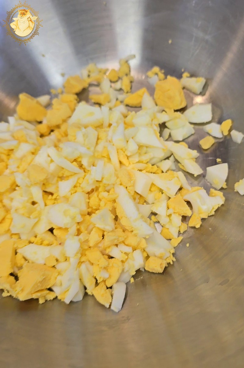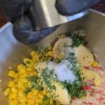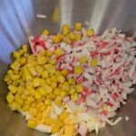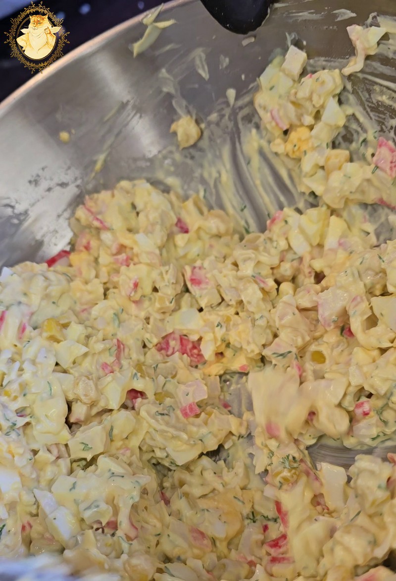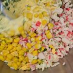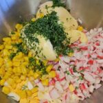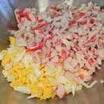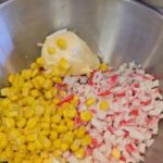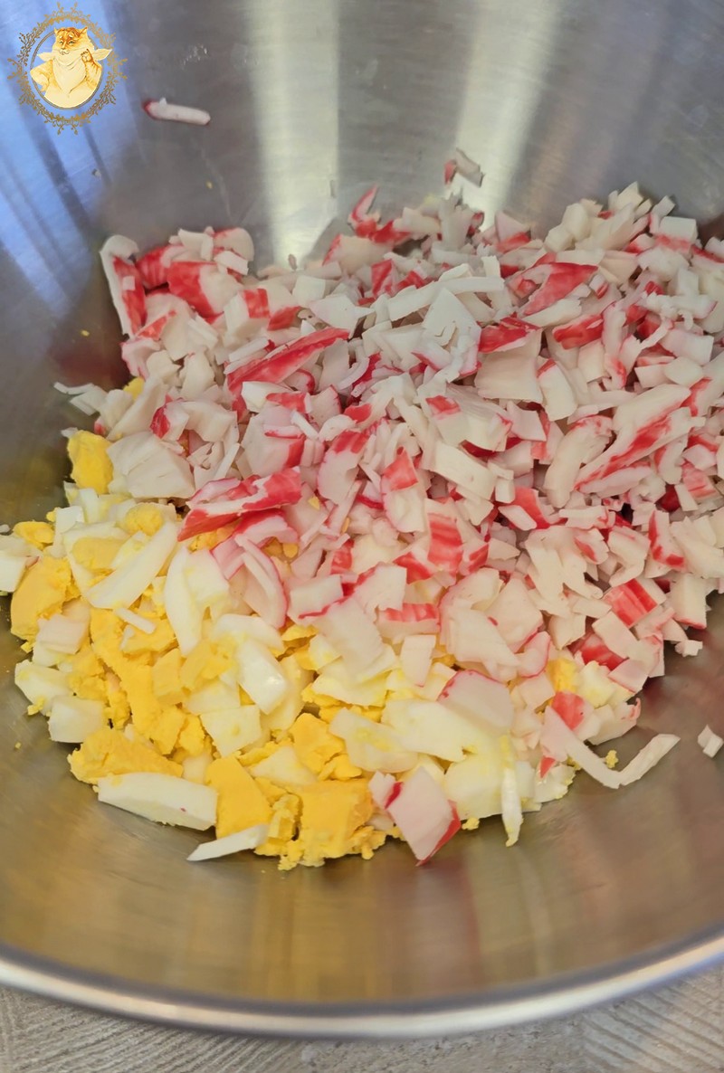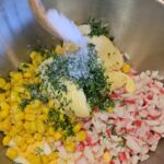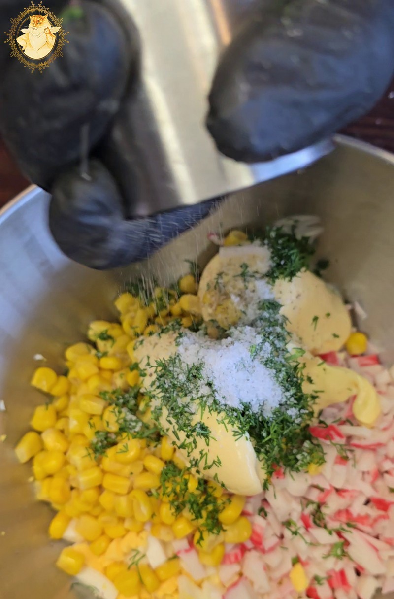 Supjaustome krabų skonio lazdeles, kiaušinius, sudedame į indą kukurūzus, įdedame majonezo, smulkintų krapų ir pipirų.