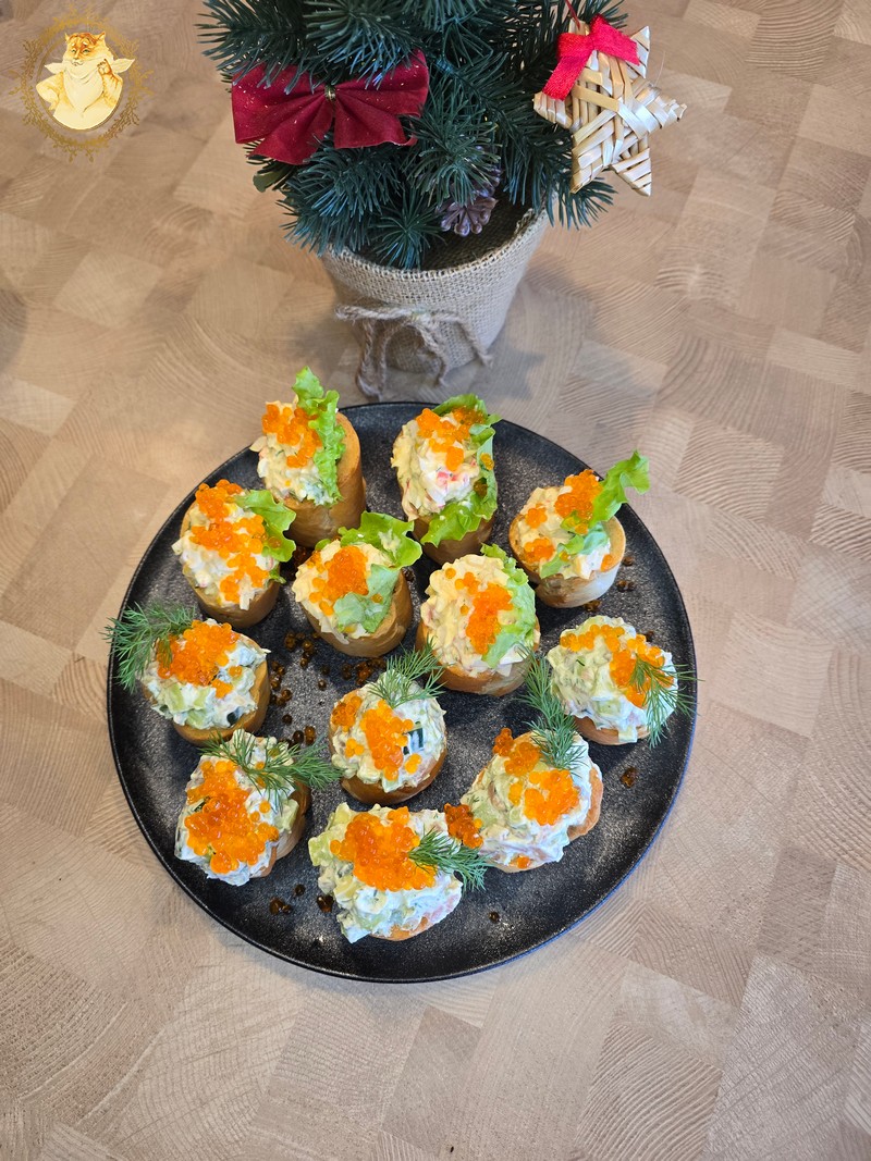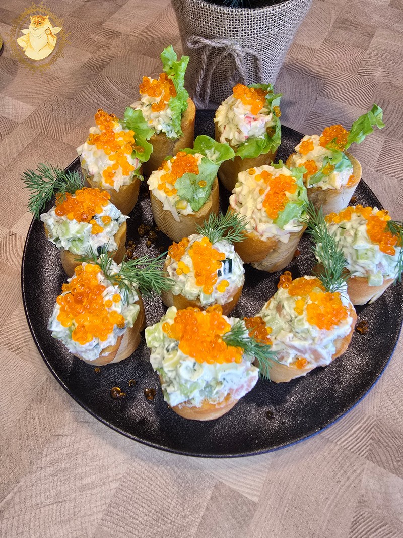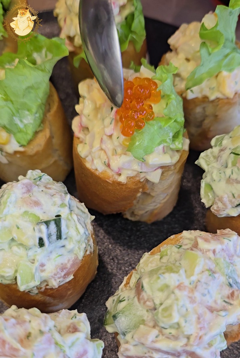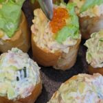 Tad štai jums užkandukų idėja su lašiša ir krabų lazdelėmis.