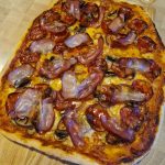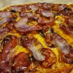 Pirma pica kepė apie 30min., tada ištraukę ant viršaus sudėjo šaltai rūkytą kiaulienos kumpį, ir dar 2-3min. atgal į orkaitę.