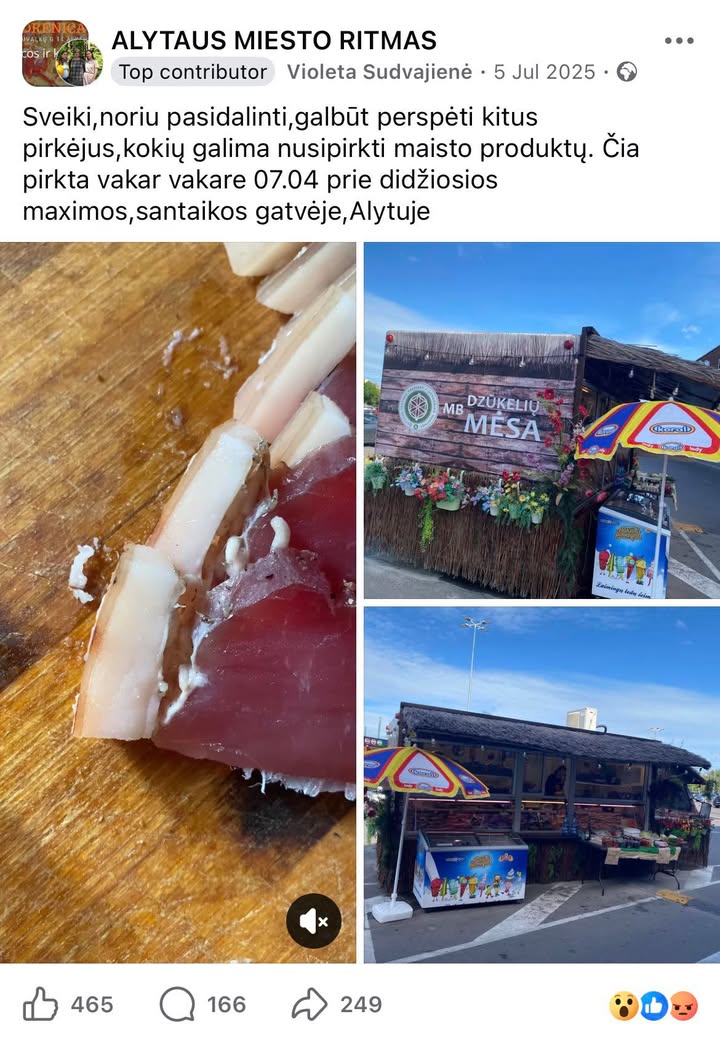 „Sveiki, ta “Dzukeliu mesa” jau seniai visiems zinoma. Pries tai buvo Slavinskienes imone, paskui turbut panaikino kazkokius leidimus, tai dzukeliu mesa persivadino. Jie prekiauja prie Alytaus maximos furgonelyje, labai labai daug Alytaus miesto grupese blogu atsiliepimu apie ju produkcija, zmones ir kirmeliu yra rade, ir visokio brudo… zinau dar kad jie vazineja su savo produkcija po mazesnius miestelius, pvz zinau Aukstadvaryje (Traku r) prekiauja turguj, dar lyg kazkur vaziuoja. Zodziu, cia viesa paslaptis, kokios antisanitarines salygos pas juos buvo.”