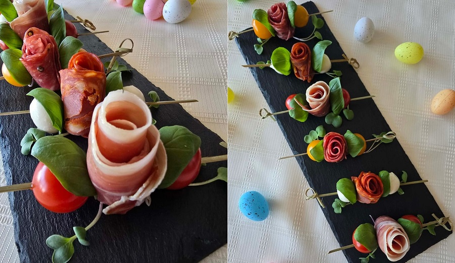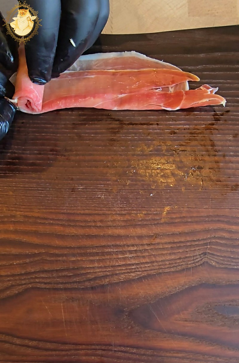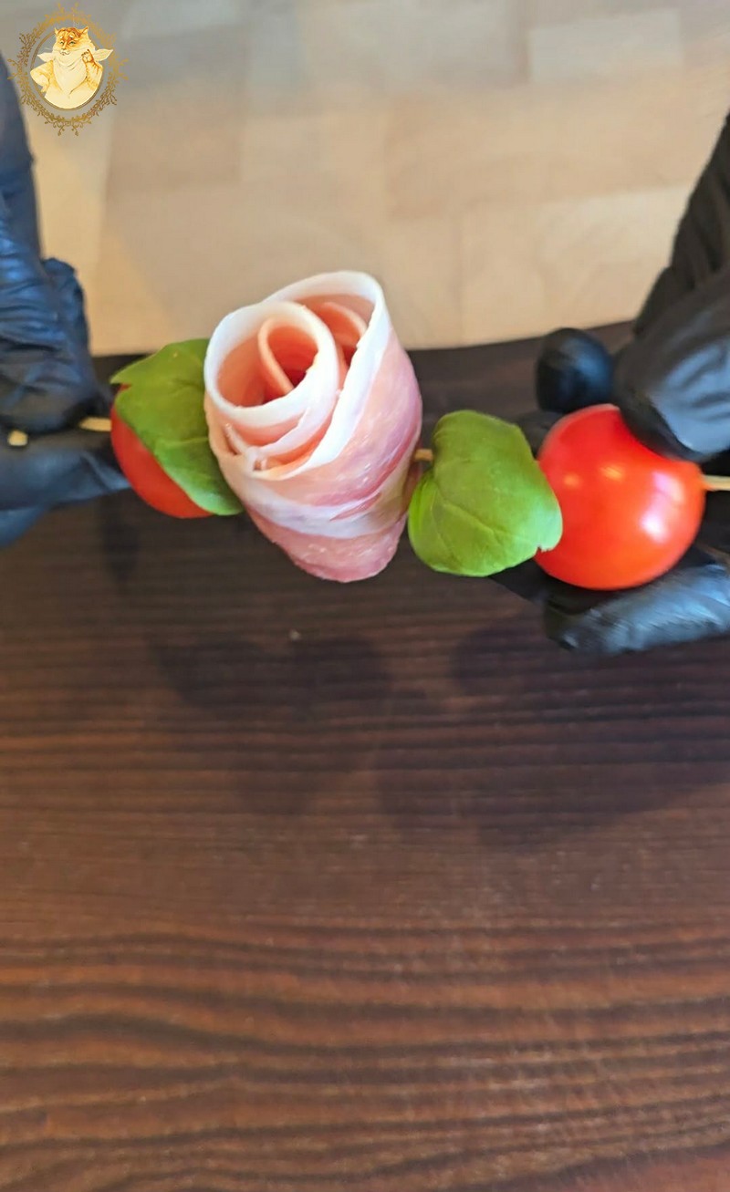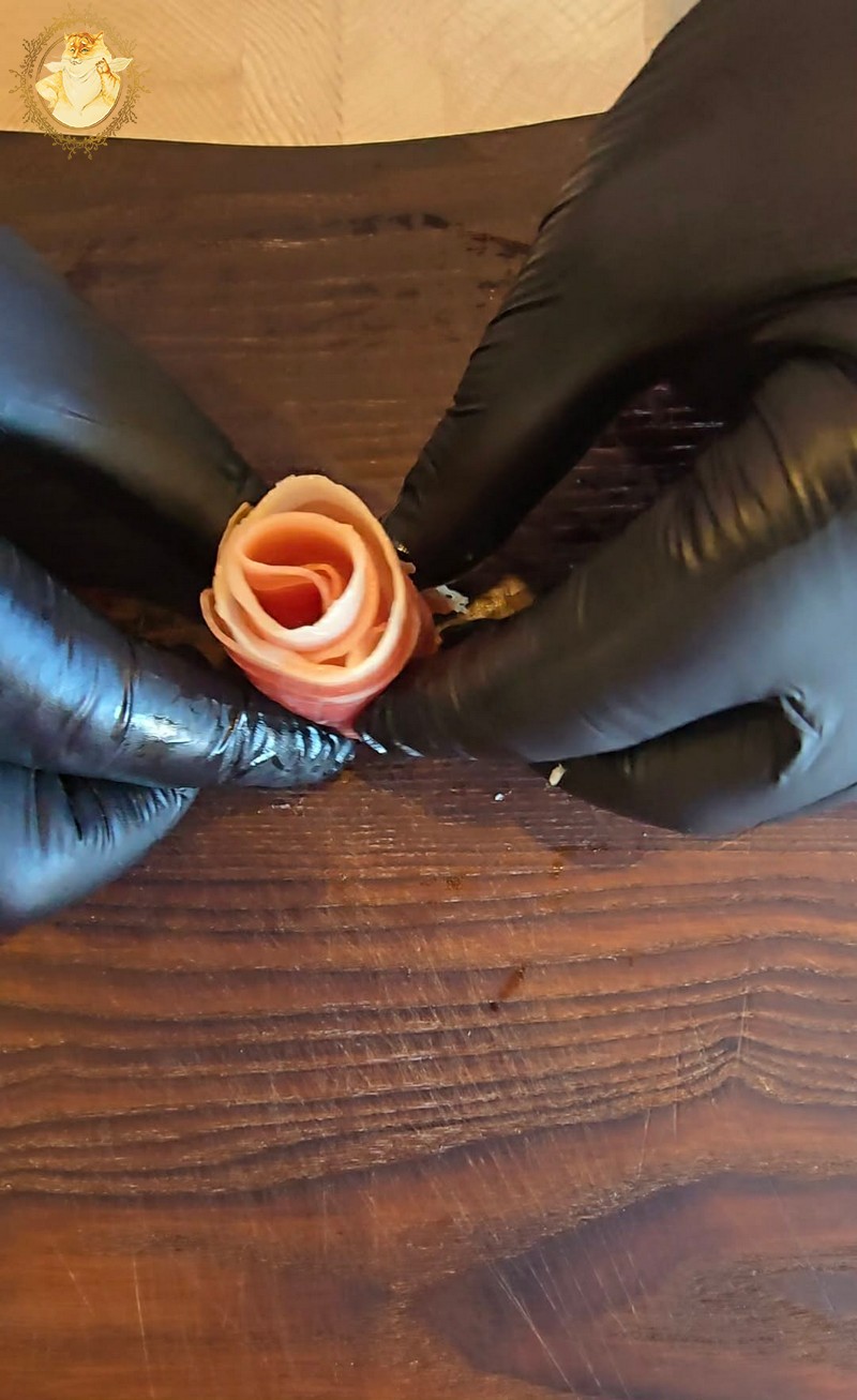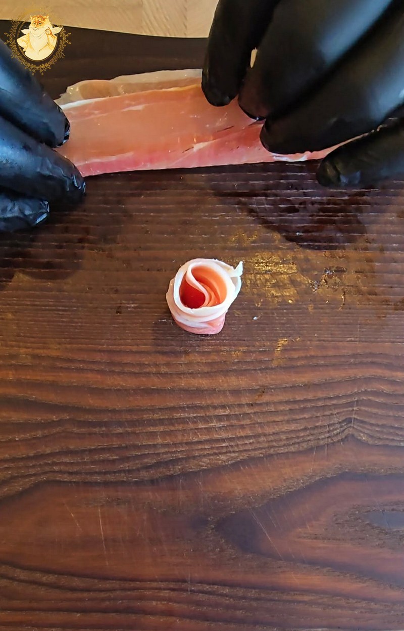 Dešros vienai rožytei reikės 4 griežinėlių, o kumpio poros.