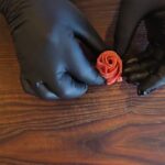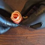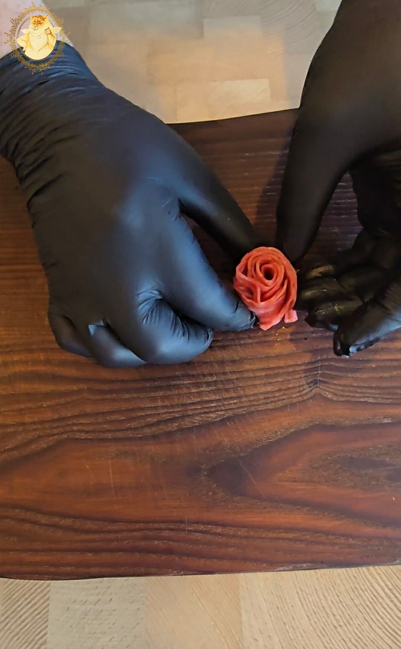 Iš kumpio ir dešros susukite rožytes, kaip tai daryti matysis apačioje prisegtame video.