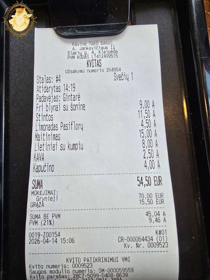 Šį kartą „Tako barui” nepalikau lipduko, nes kaip matote iš nuotraukos šalia čekio jie jį jau turi. Tad vertinimo balas nesikeičia – 5/5, ir galimai greitu metu aš vėl sėdėsiu šiame bare ir valgydamas stintas galvosiu apie tai, kad gyvenime man pasisekė labiau nei kitiems…