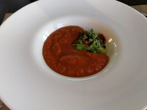 Kadangi ruduo mus dar lepino vasariškais orais, nusprendžiau save palepinti vasariška šalta pomidorų sriuba – gaspaču. Prisipažinsiu – ją gamindamas, aš visas daržoves sutrinu į vientisą masę, tad čia sriuba mane maloniai nustebino ir savo patiekimu. Lėkštėje puikiai atrodė agurkų juostelės su vytintais pomidoriukais ir gaspačas, kurį pusmėnuliu į lėkštę supylė padavėja, patiekdama sriubą.