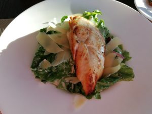 Salotos kainuoja 6,50 euro, ir patikėkite – jos vertos kiekvieno išleisto euro cento. Vištieną nufotografavau iš arti norėdamas parodyti tą sultingumą, kuriuo man teko mėgautis. Puikiai tiko ir stambokai supjaustytas kietasis sūris. Padažas, traškios salotos susiliejo į vieną visumą. Prisipažinsiu – aš seniai taip besimėgavau maistu restoranuose.