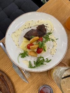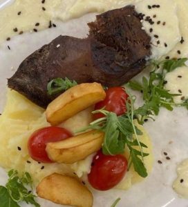 Užsakėme skiltelėmis gavom šiaudelius, topas buvo jautienos liežuvio kepsnys.