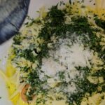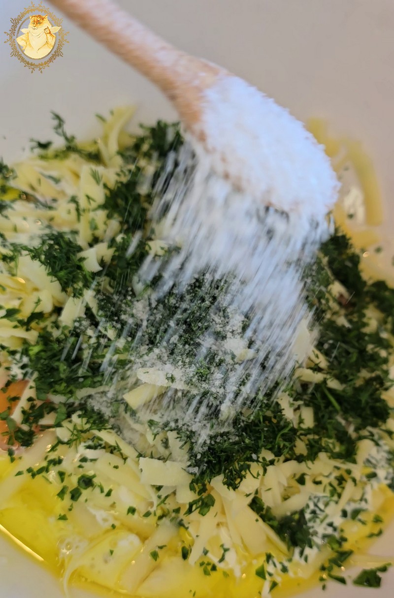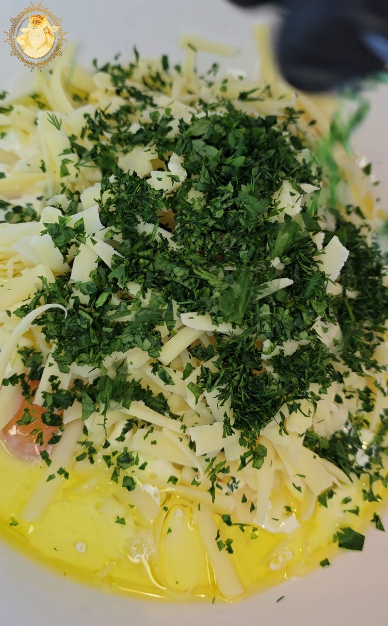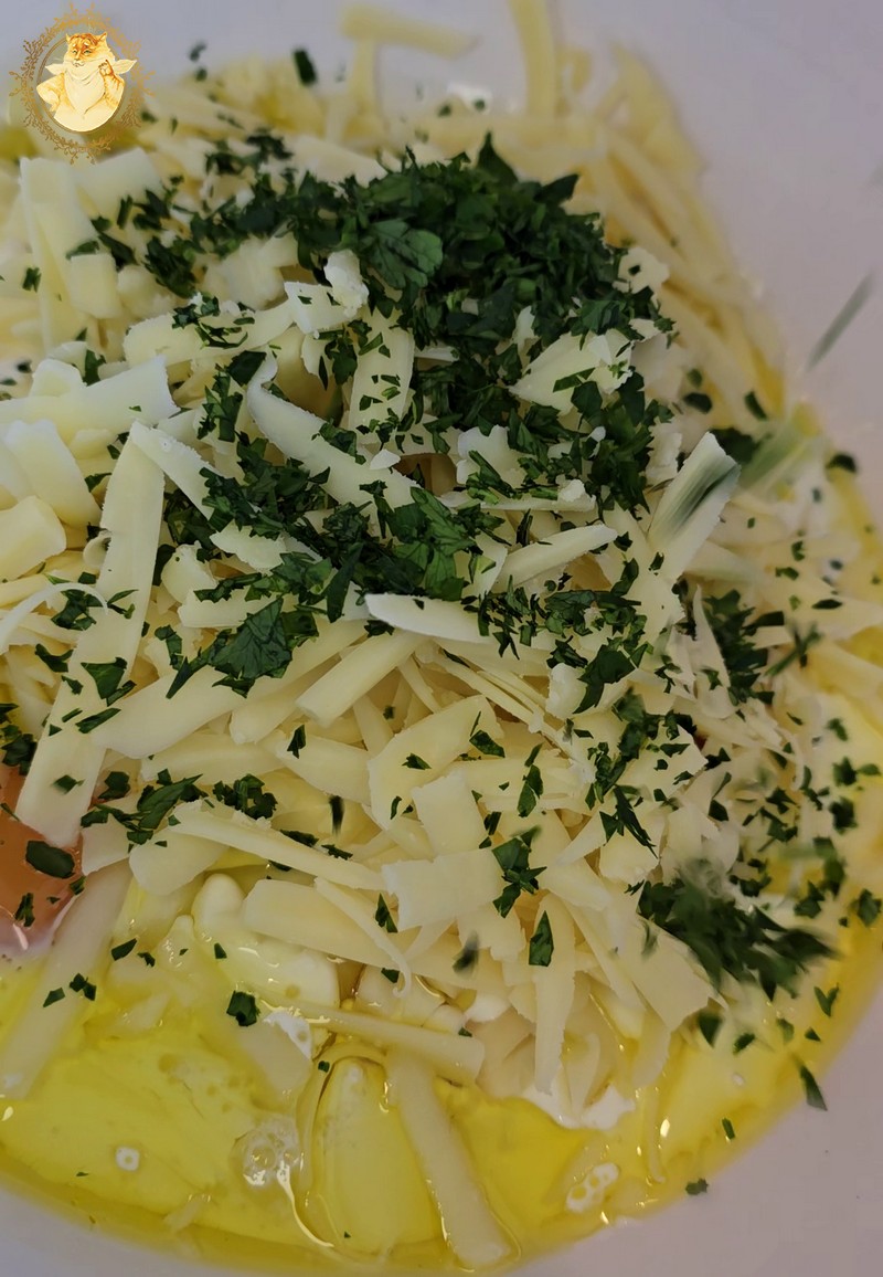Dedame smulkintų krapų, petražolių ir tarkuoto švelnaus čederio sūrio.