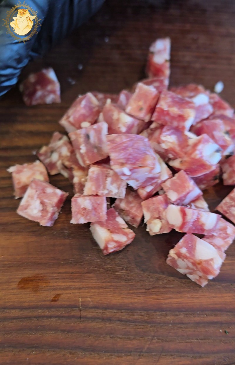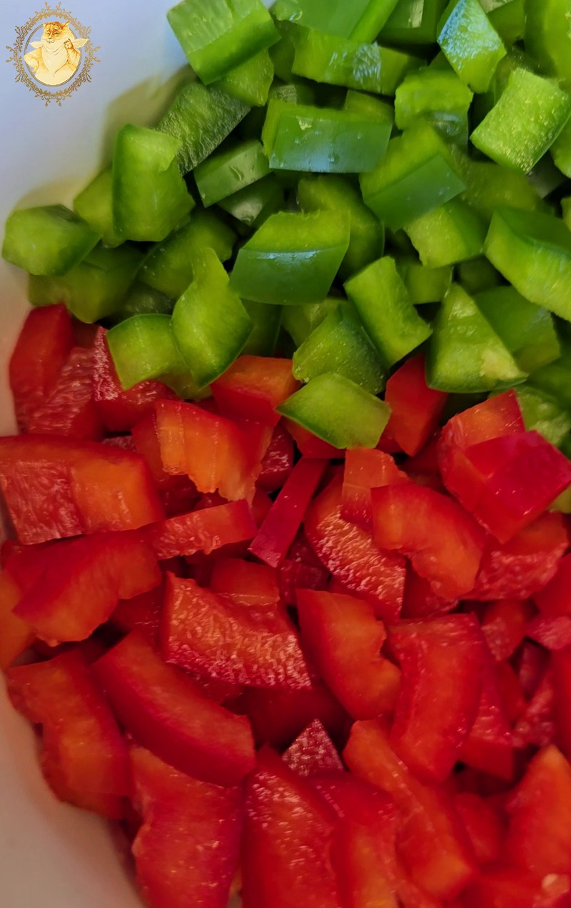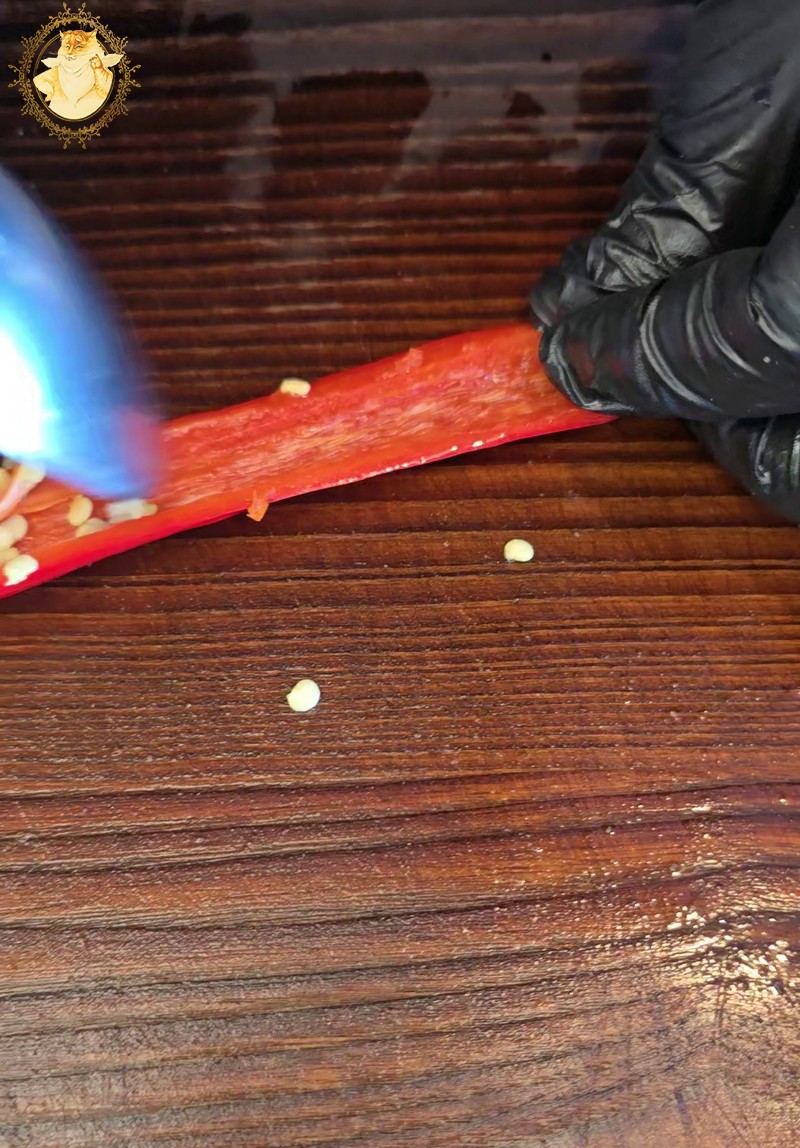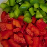 Susipjaustome saldžiąją papriką, vytintą dešrą, ir norui esant – sumuštiniams suteikti aitresnių natų, vieną kitą aitriąją papriką.