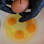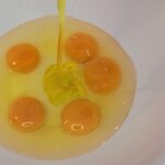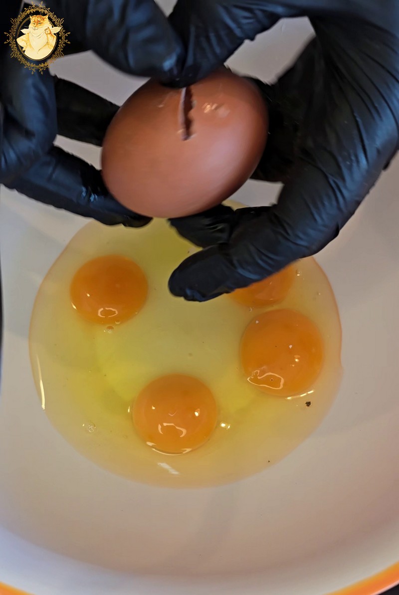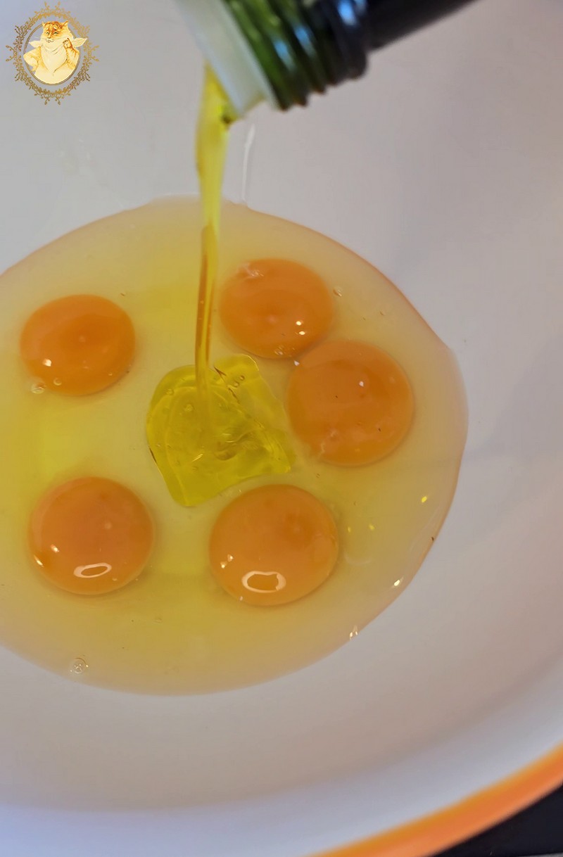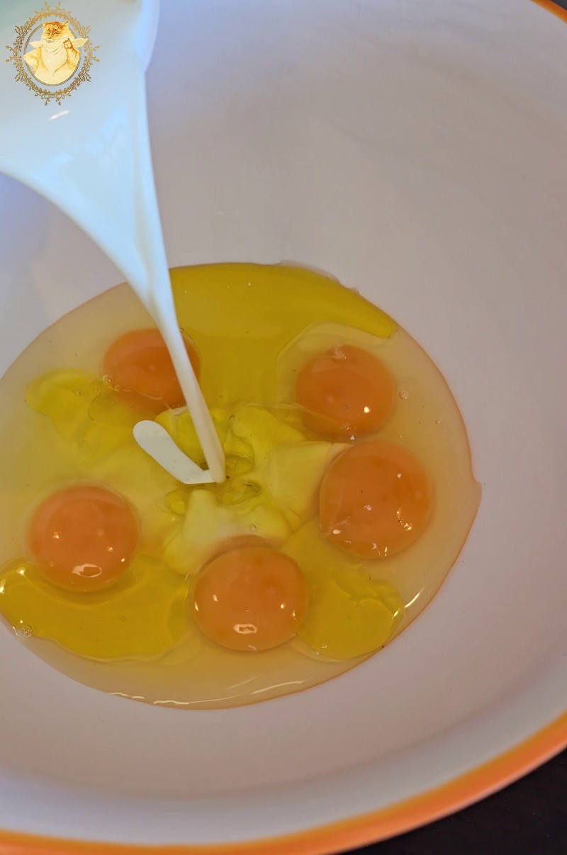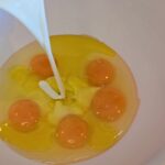Tada į indą įmušame kiaušinius, pilame aliejaus, pieno, arba kaip šiuo atveju pasigedęs šaldytuve pieno, vietoje jo per pusę su vandeniu skiedžiau grietinėlę.