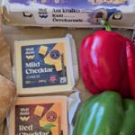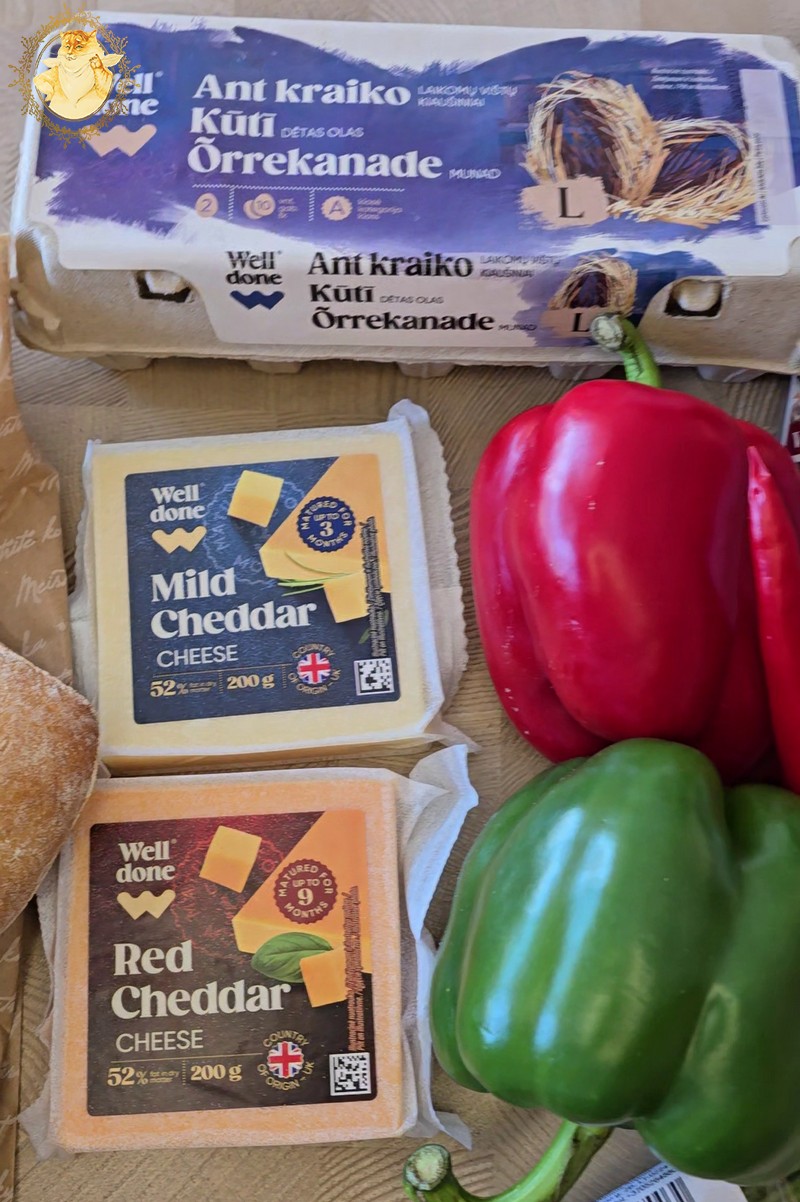 Tada sumuštinius jau sudėtus į skardą ant kepimo popieriaus gardiname tarkuotu raudonuoju čederio sūriu, paprikomis ir vytinta dešra.