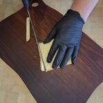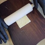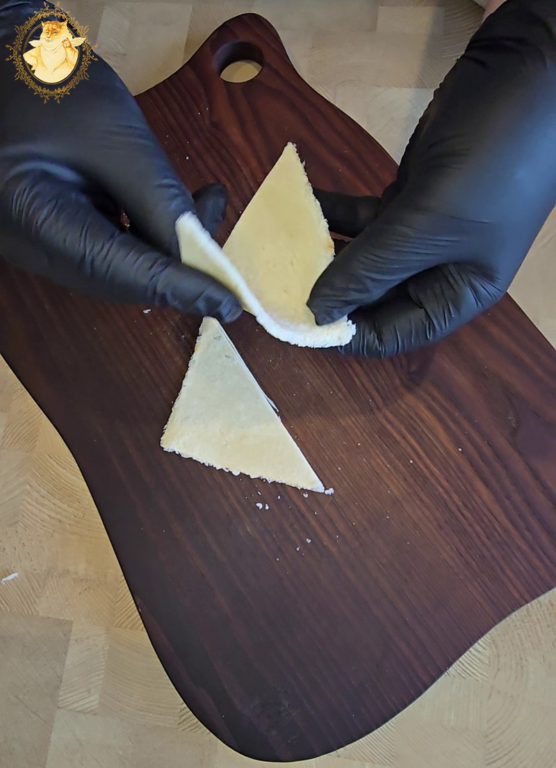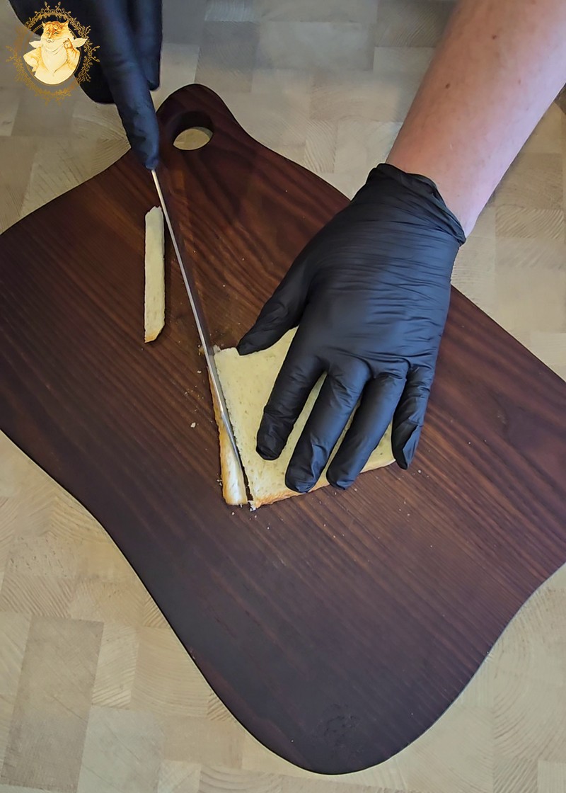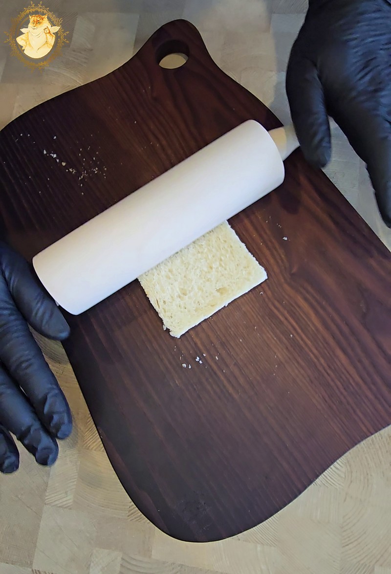 Pirmiausia nupjaustome forminės duonos kraštus, tada ją kočėlo pagalba kiek suplojame, o jau vėliau perpjovę skersai suformuojame piltuvėlio formos krepšelius.
