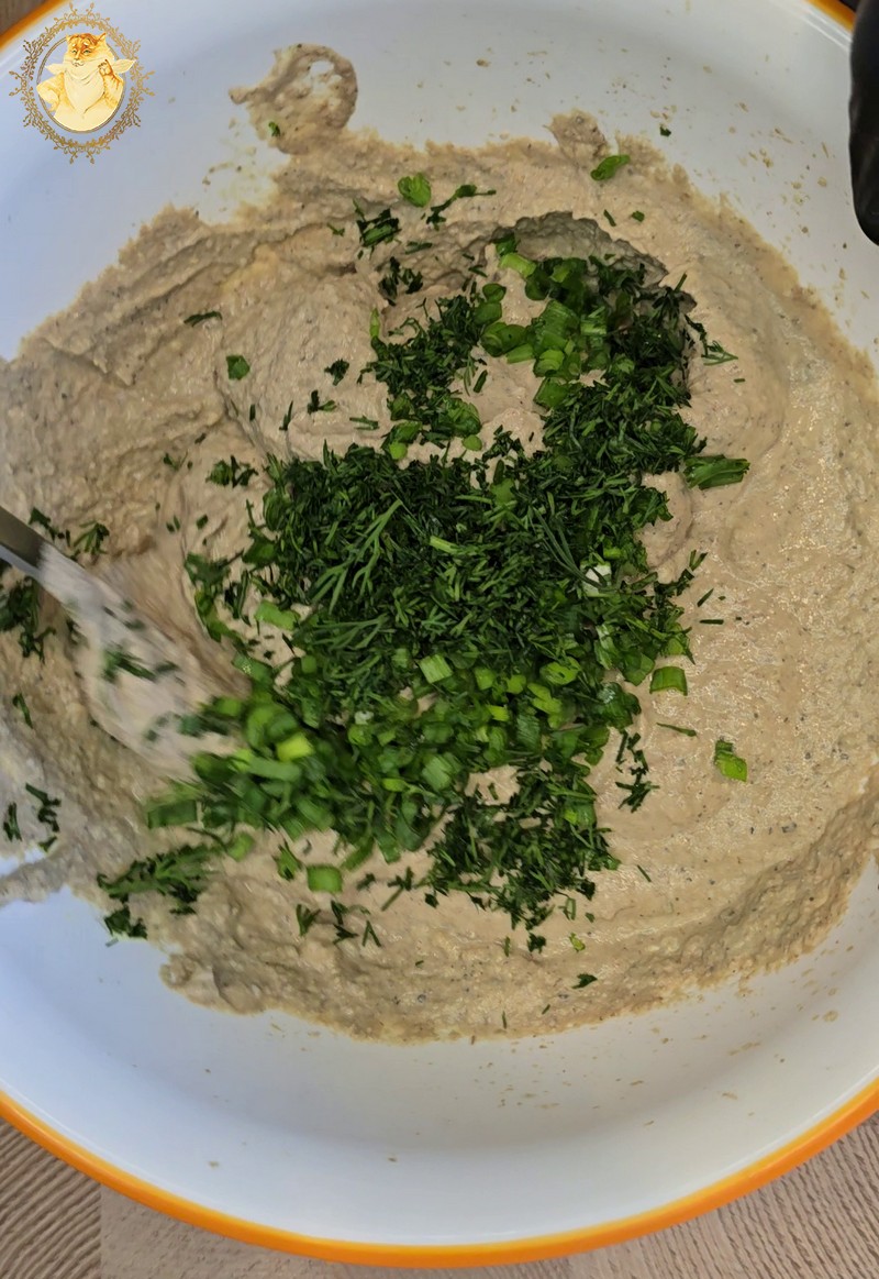 Tada pagardinę pasigamintą masę pjaustytais krapais ir svogūnų laiškais, pasigamintu turiniu pripildome piltuvėlius.