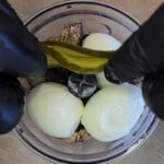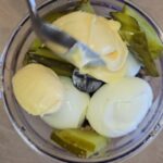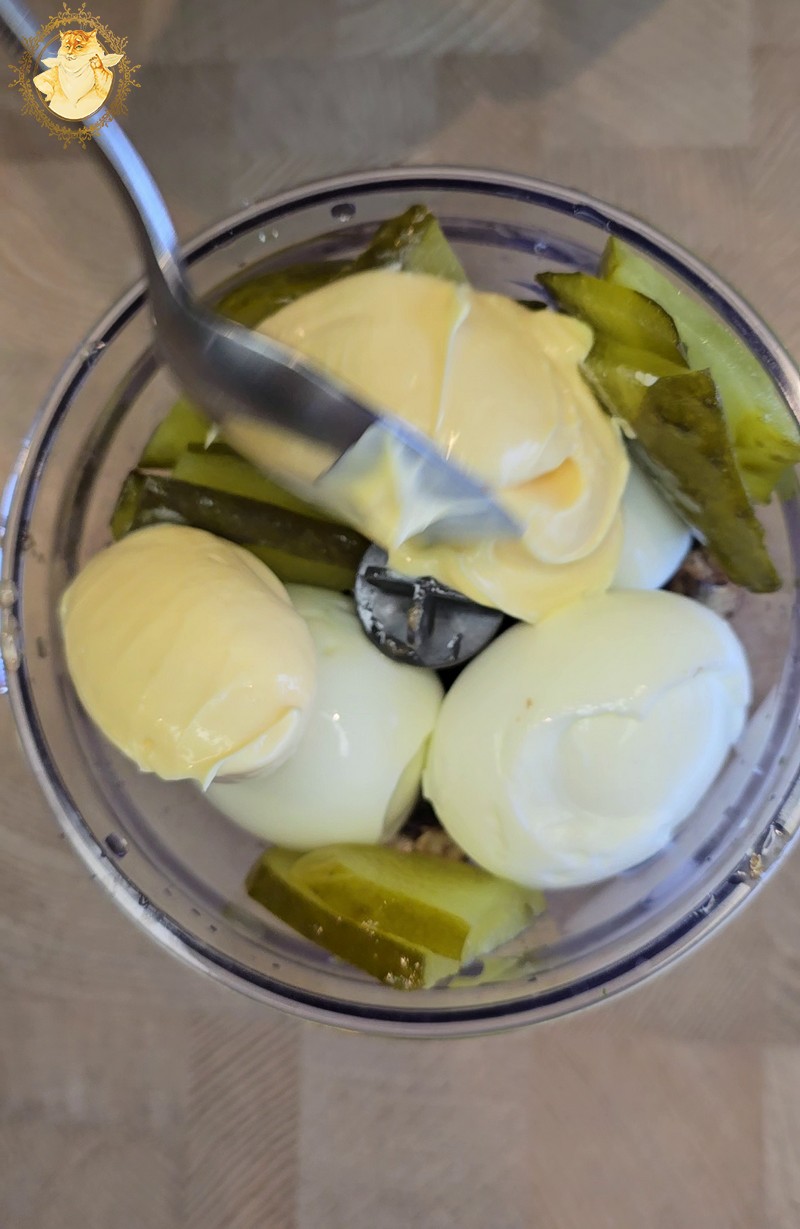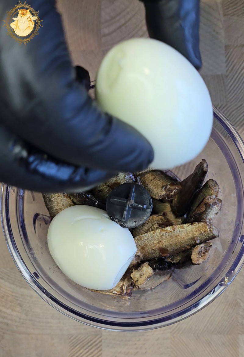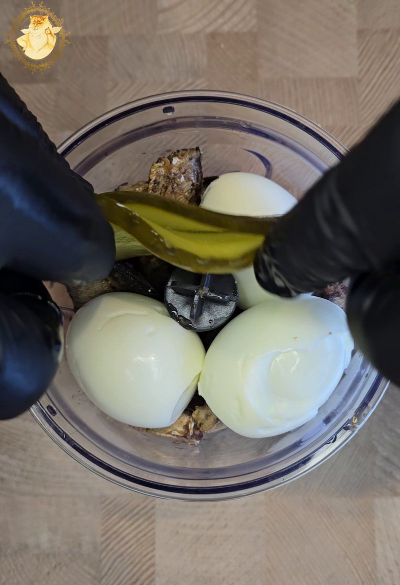 Tada į smulkintuvo indą sudedame šprotus, virtus kiaušinius, marinuotus agurkus, majonezą ir viską susmulkiname iki vientisos masės.