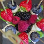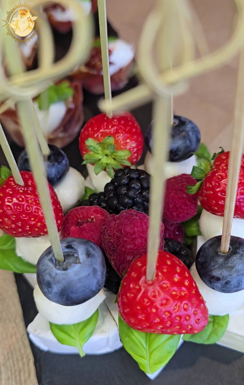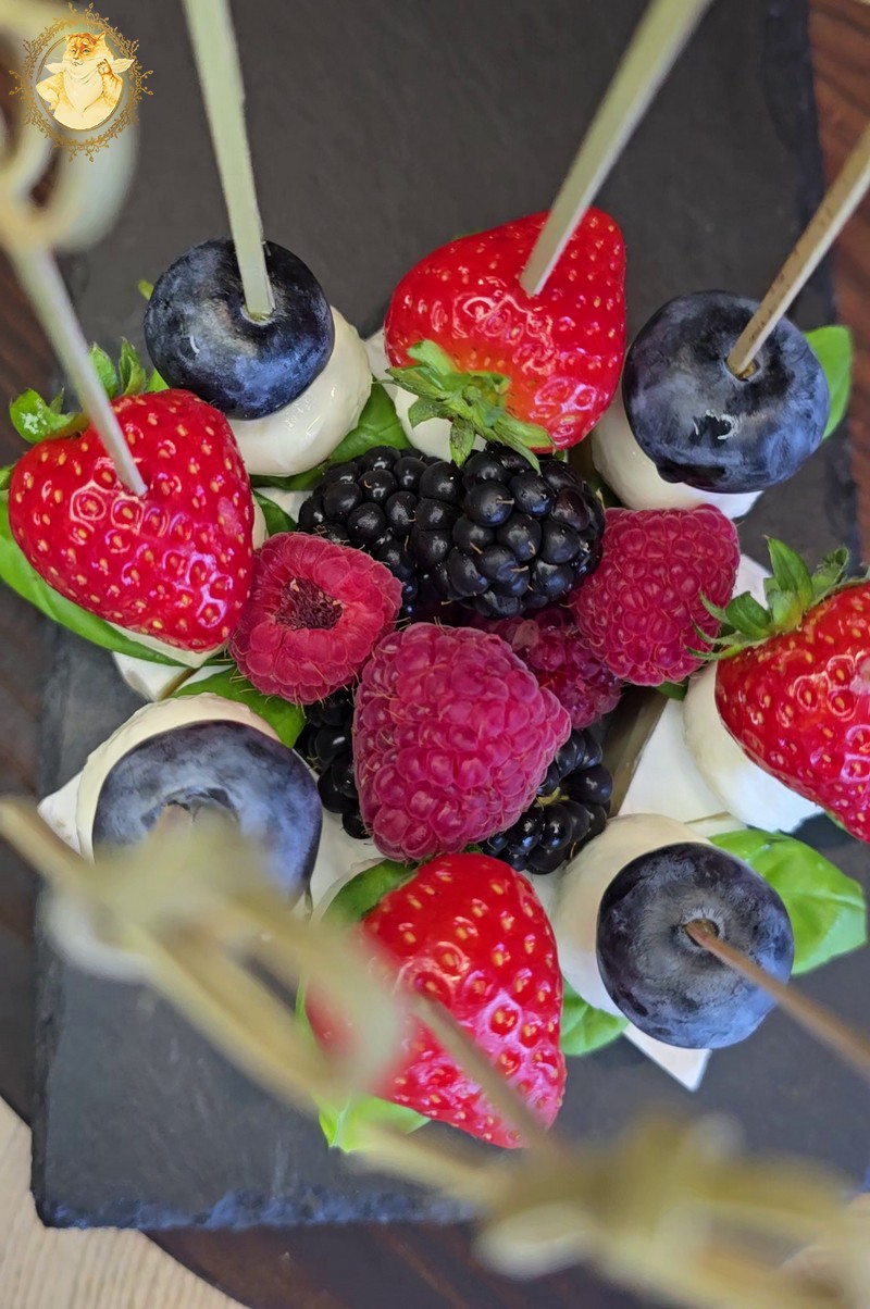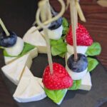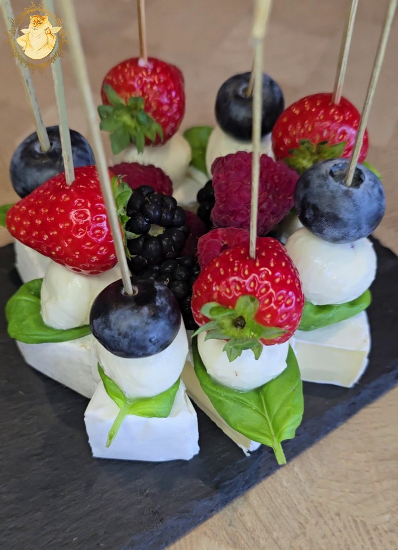 Kamamberto sūrį supjaustome lygiais trikampėliais, ant jo smeigtukų pagalba susmeigiame baziliko lapelius, braškes, šilauoges, mocarelos rutuliukus.