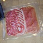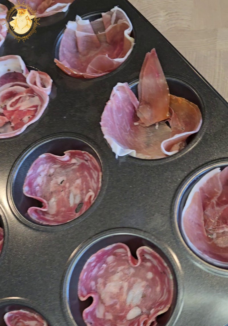Į keksiukų kepimo formeles sudedame kumpį, dešrą, formuodami kažką panašaus į krepšelius.