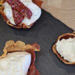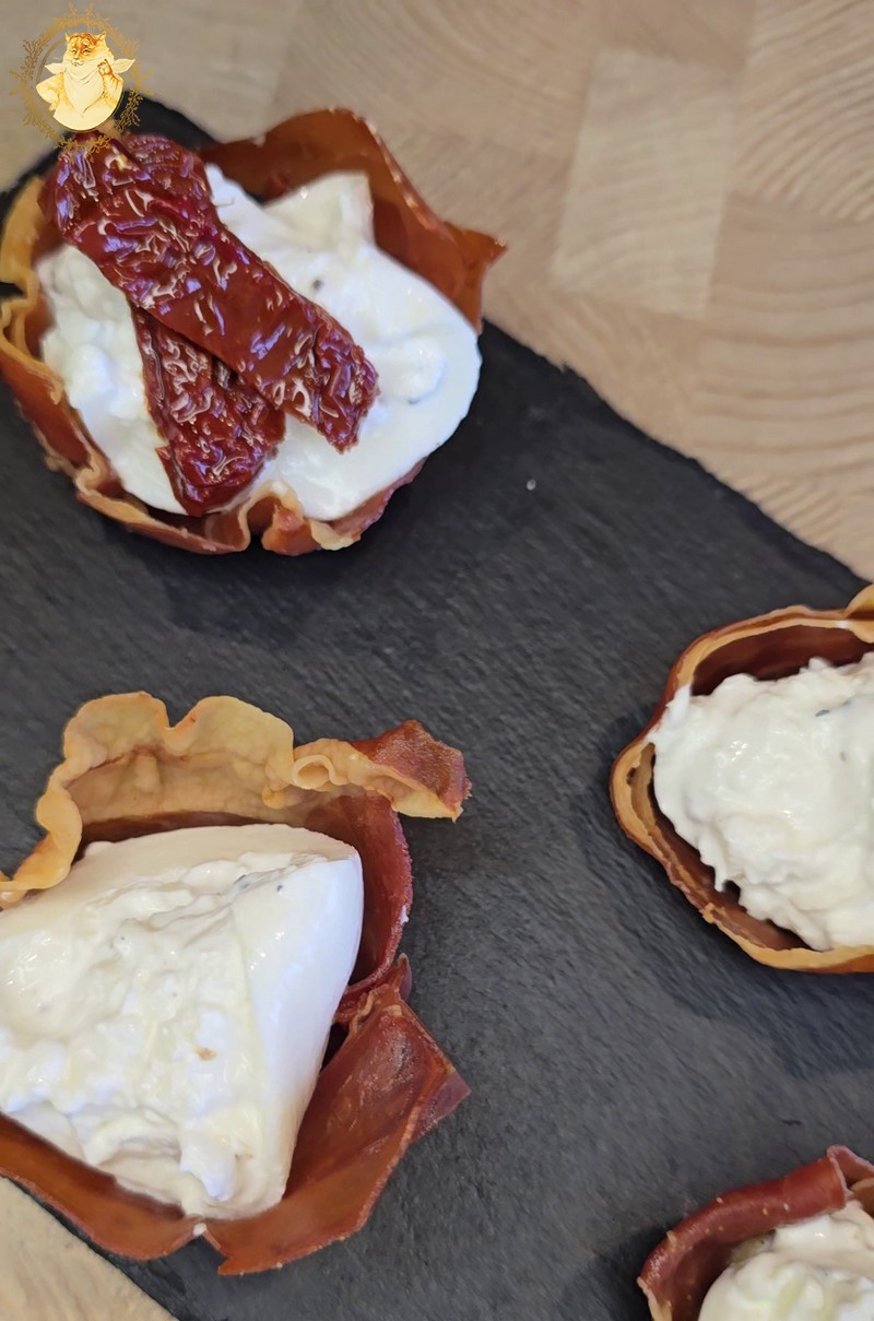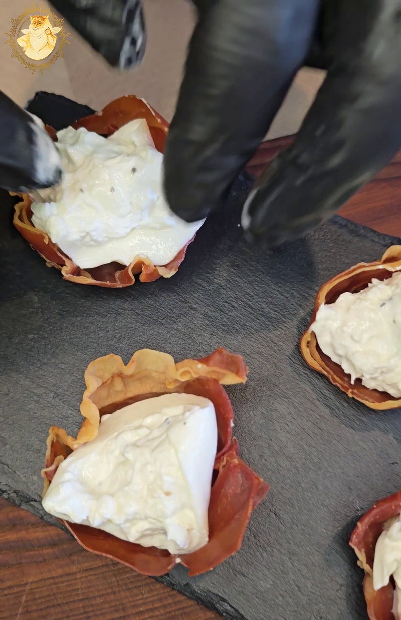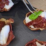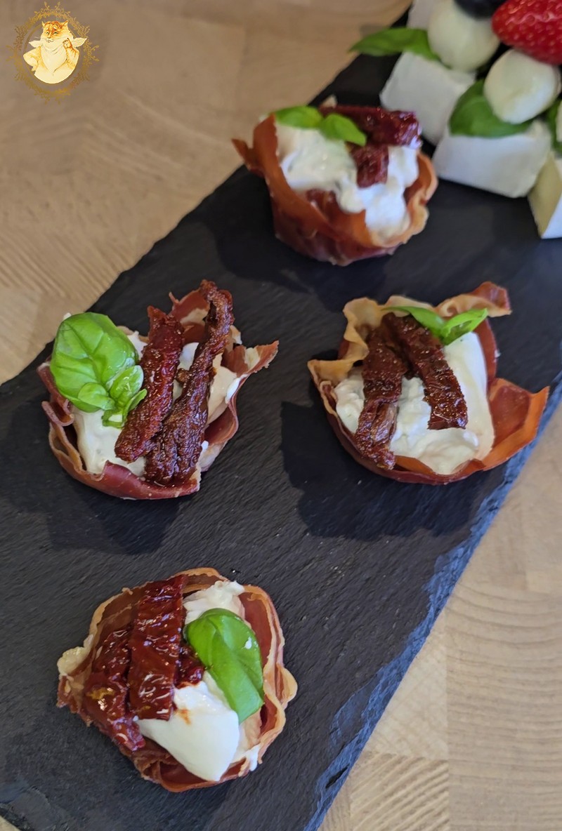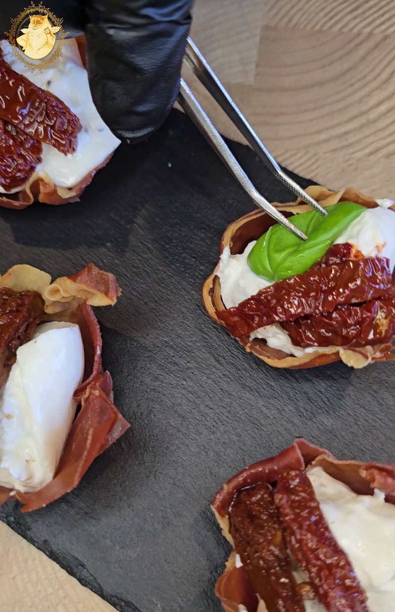 Kuriuos gardiname burata su trumais ir Well done premium saulėje džiovintais pomidorais, papuošiame baziliko lapeliais ir pašlakstome kreminiu padažu su balzaminiu actu.