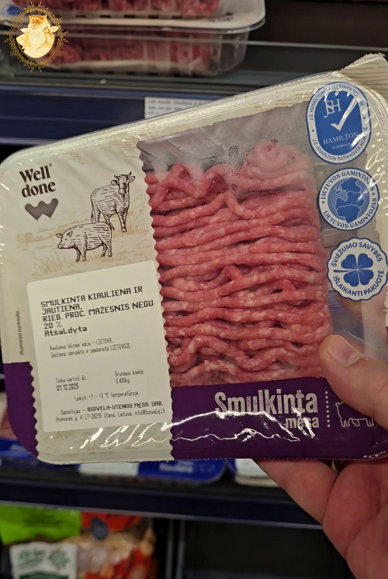 O tuo metu išsiėmę iš šaldytuvo maltą jautienos ir kiaulienos mėsą, ją suprieskoniuokite savo mėgstamais prieskoniais, arba tiesiog tik druska ir juodaisiais pipirais.
