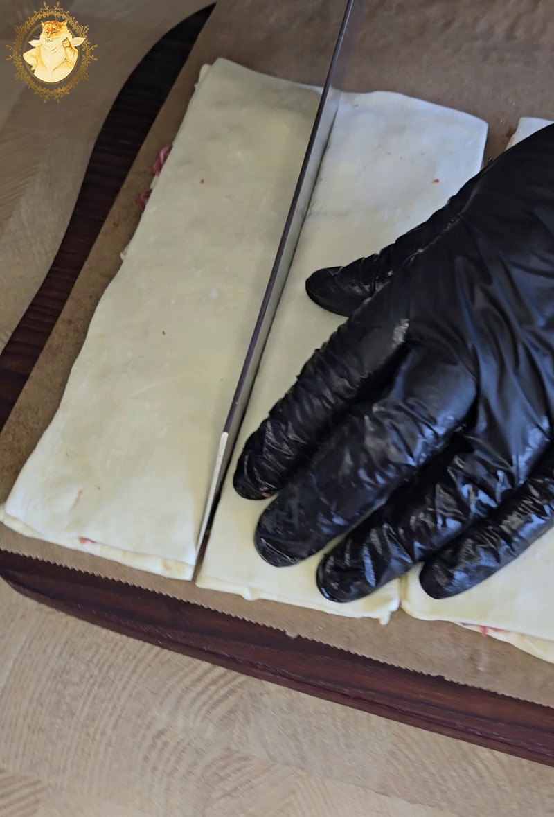 Kadangi „Well done” sloksniuotos tešlos pakuotėje yra 6 vienodi tešlos lakštai, tai 3 iš jų sutepę pagardais, uždengiame likusiais trejais.