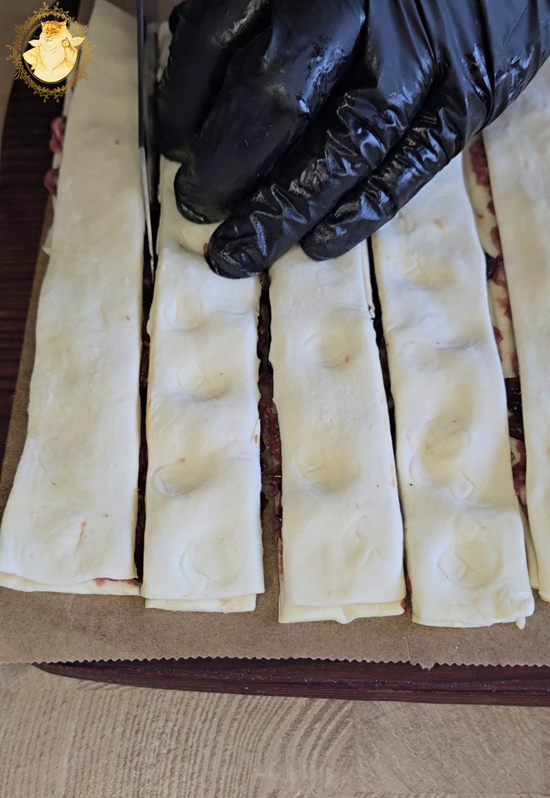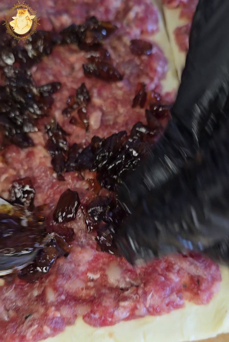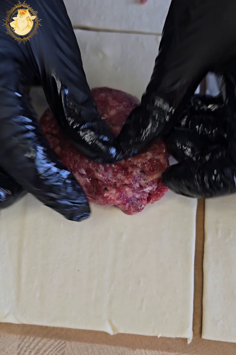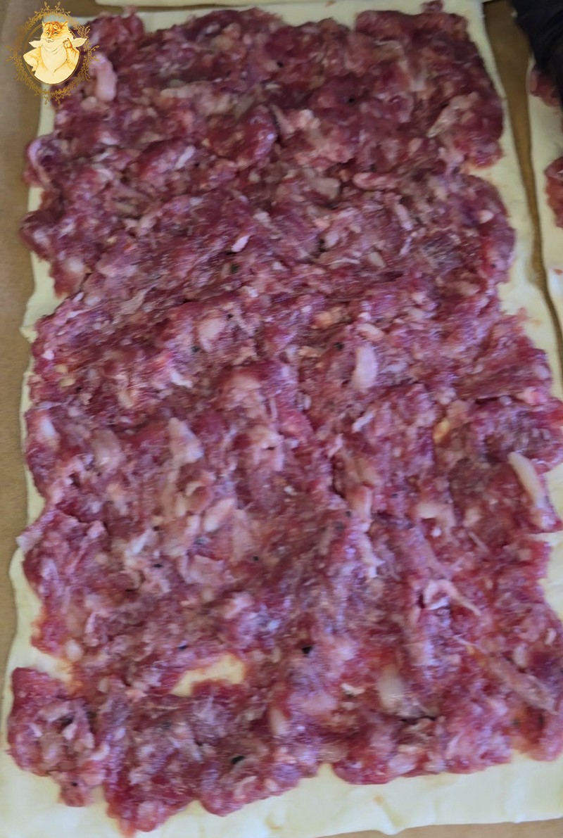 Tešlai suminkštėjus ant jos dedama malta mėsa, taip kaip parodyta nuotraukose.