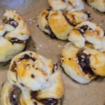 Kiekvieną juostelę susukę į spiralę, iš jos formuojame bandelę.