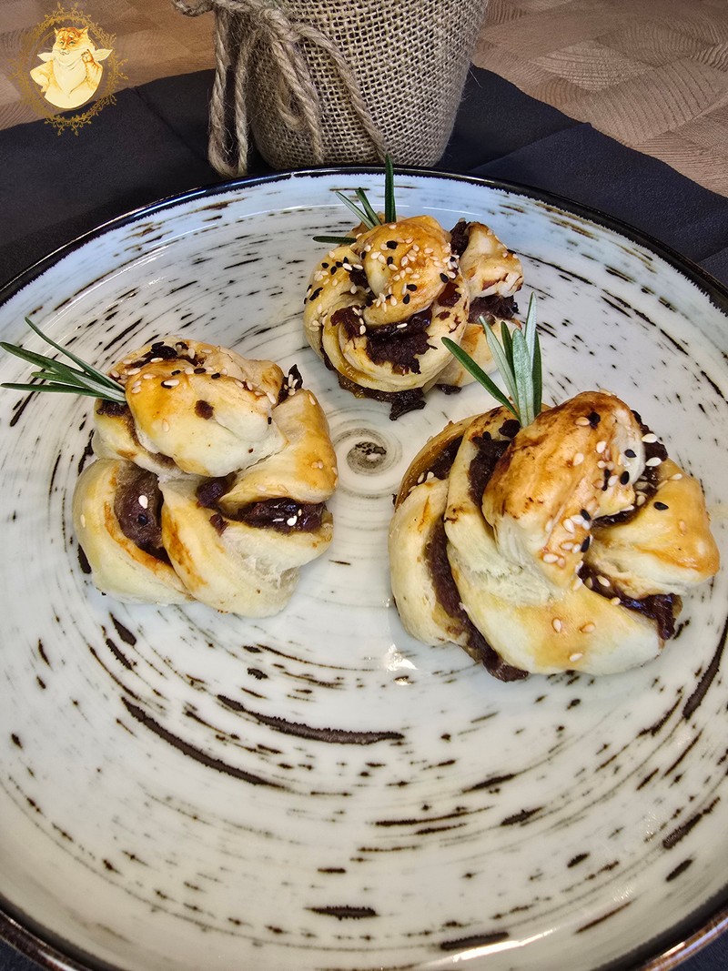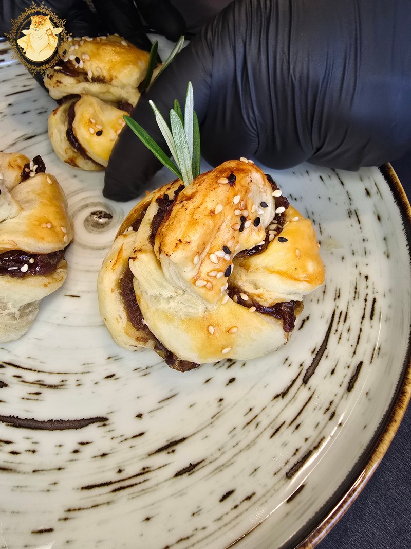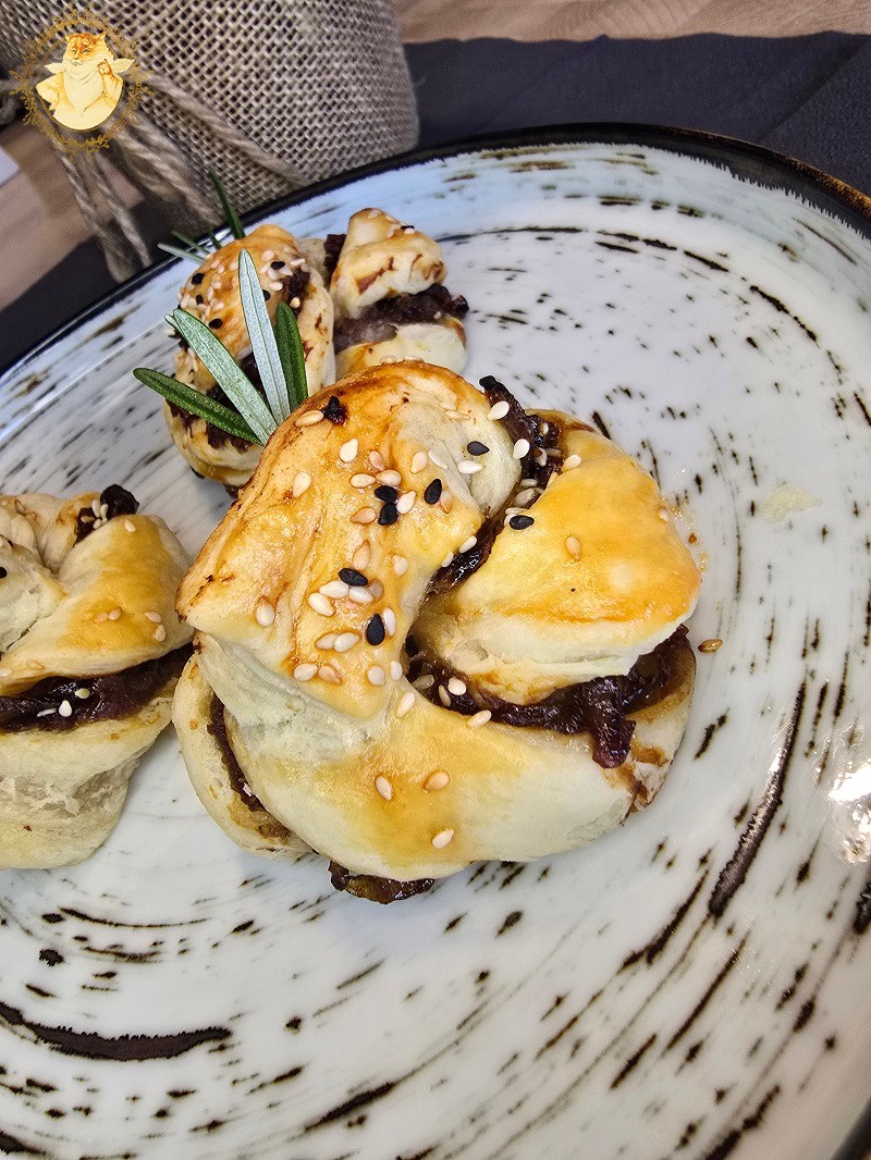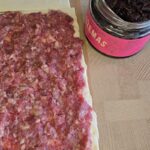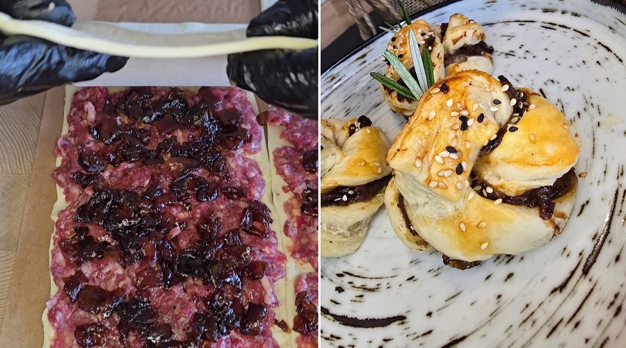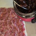 Tada ant maltos mėsos tolygiai užtepame karamelizuotų svogūnų džemo.
