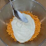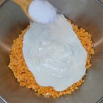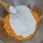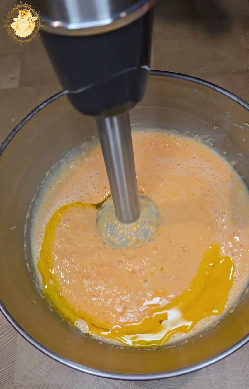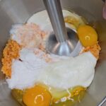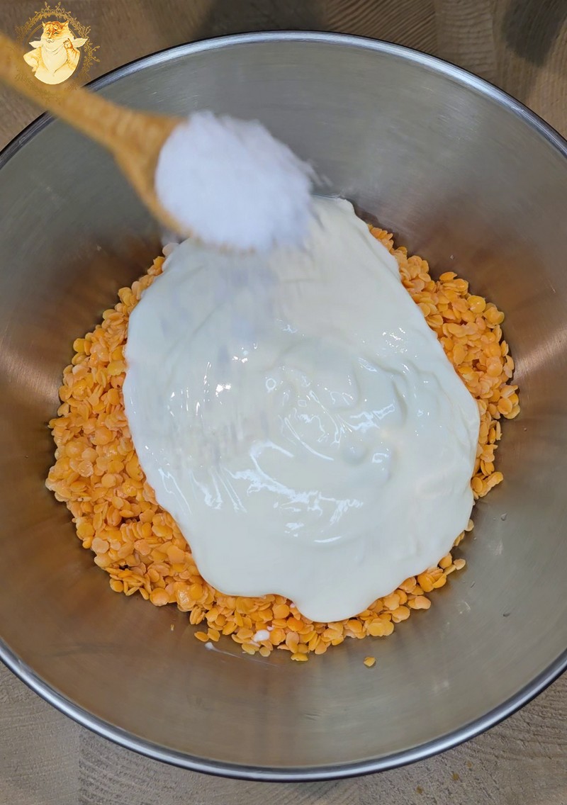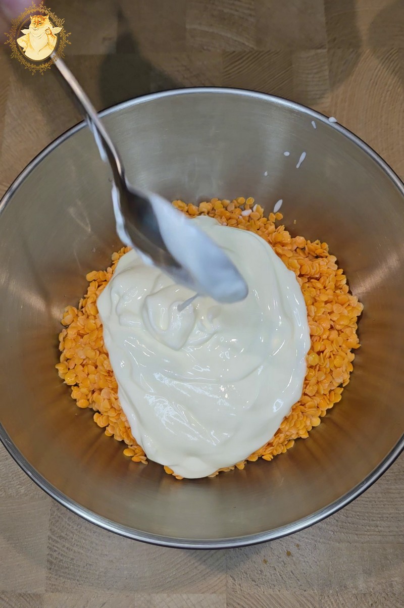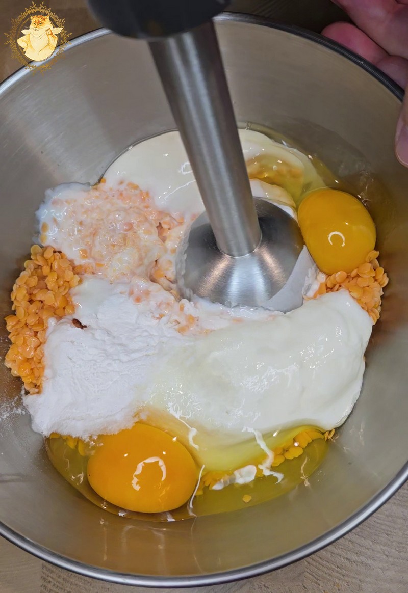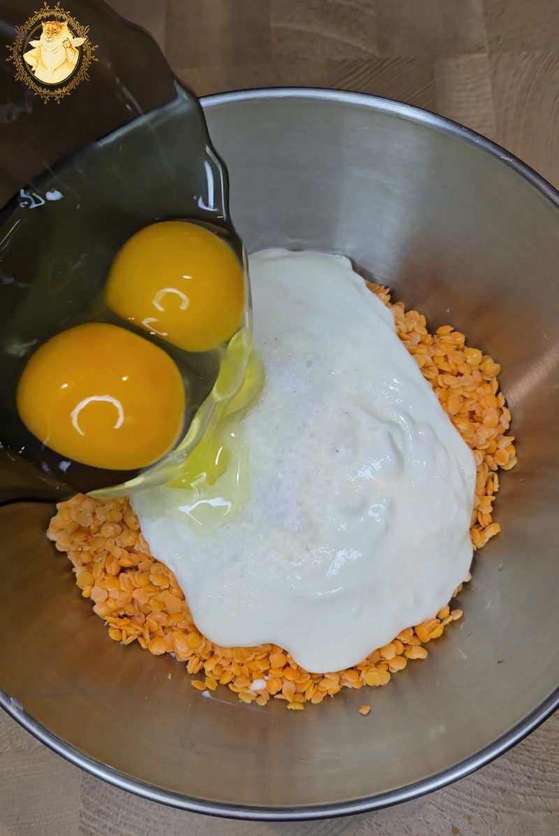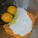 Vėliau nupylę vandenį įmuškime pora kiaušinių, sudėkime jogurtą, kepimo miltelius, druską ir nepamirškime aliejaus.
