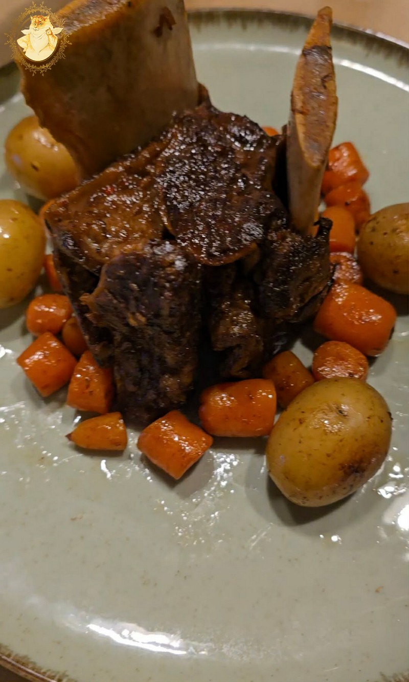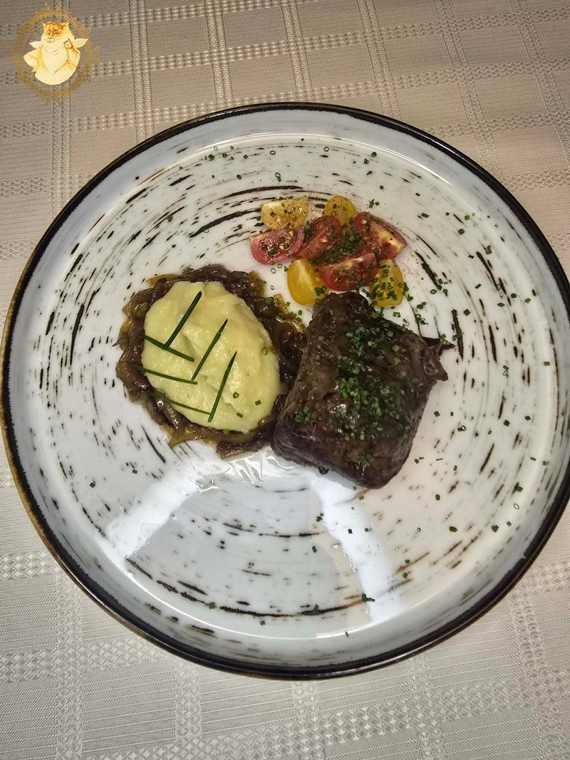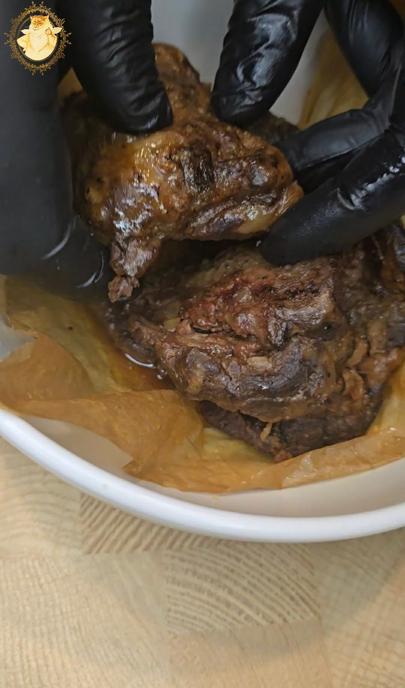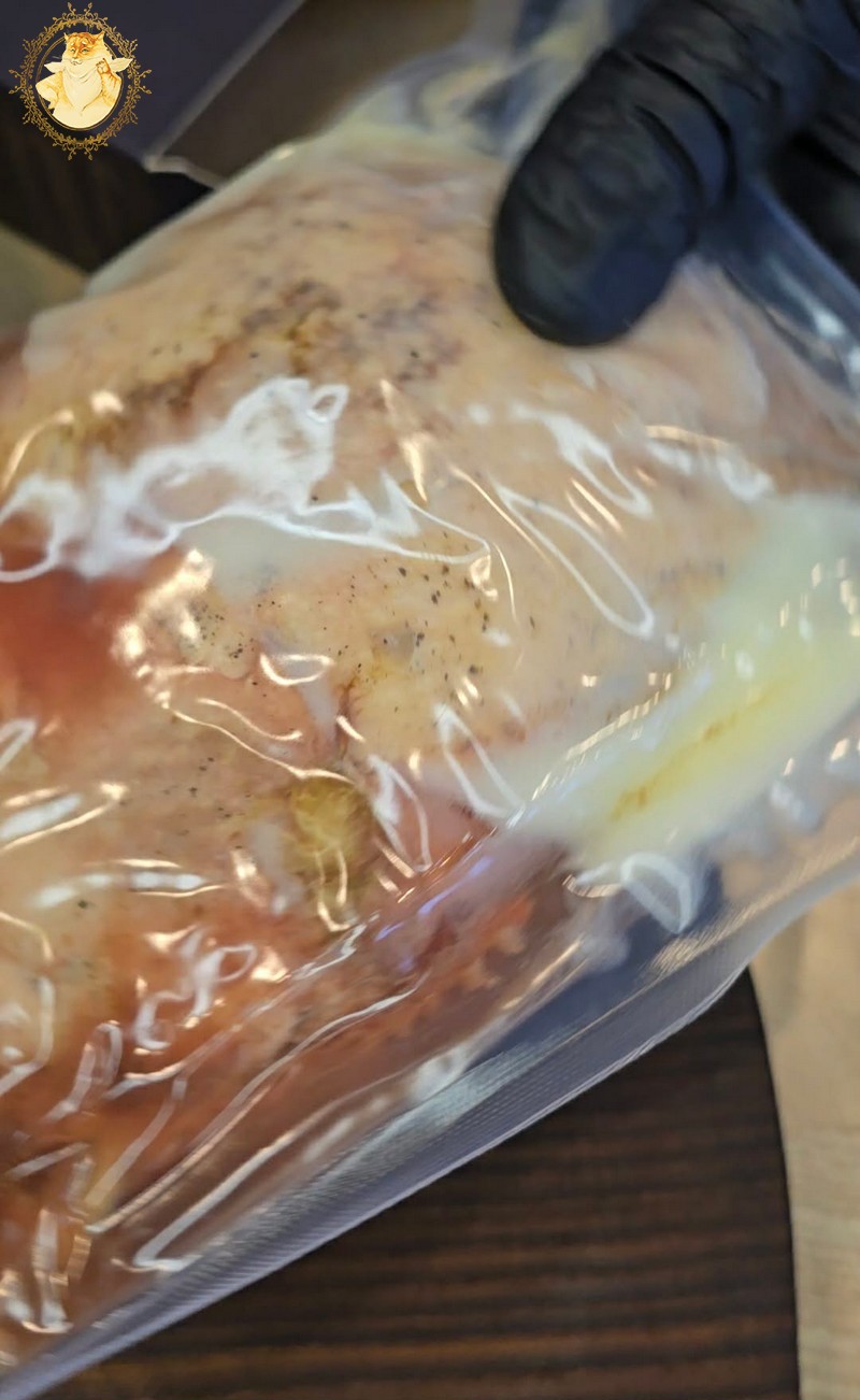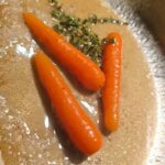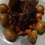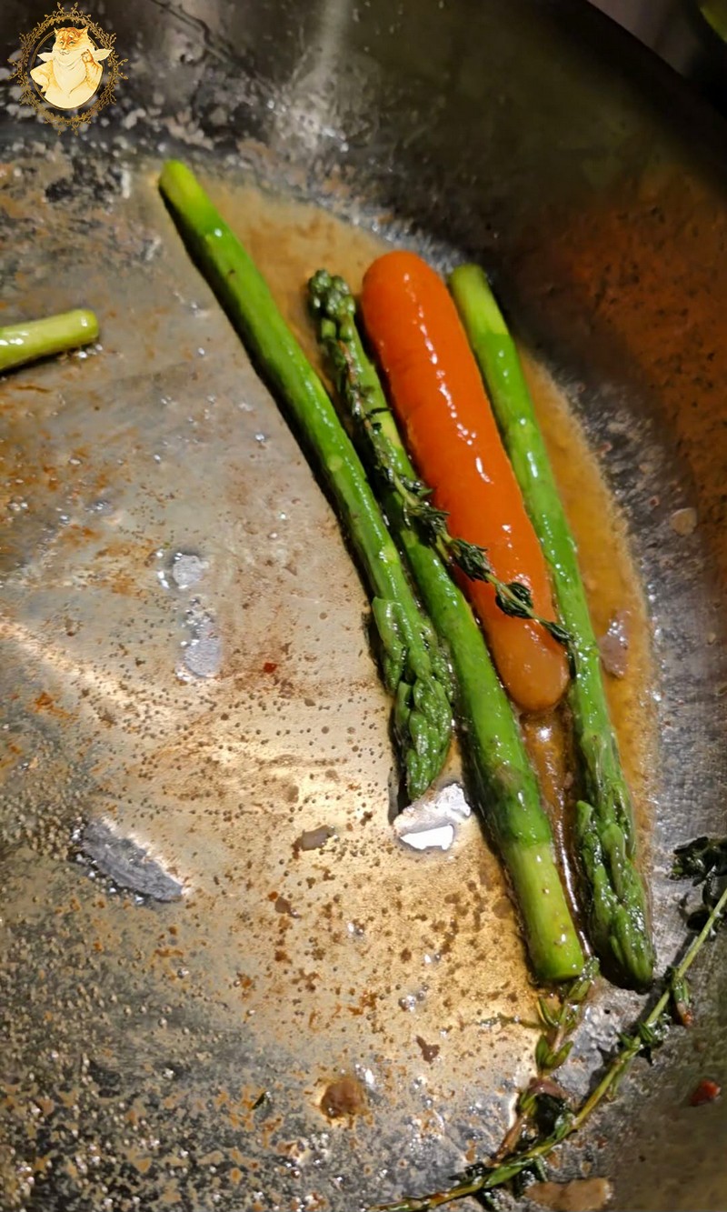 Tiek anties koją, tiek jaučio šonkaulius, ar jaučio žandus, prieš tiekiant išėmėme iš vakuumo ir padėję ant kepimo popieriaus ir susukę į foliją, pašildėme 180C apie 30 min., tada praskleidę folijją leidome kiek apskrusti.