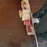 Tad antras žingsnis supjaustykite mėsą panašaus dydžio kaip aš kubeliais, tik nesupjaustykite spirgučių dydžio, šiam patiekalui reikia didesnių mėsos gabaliukų.