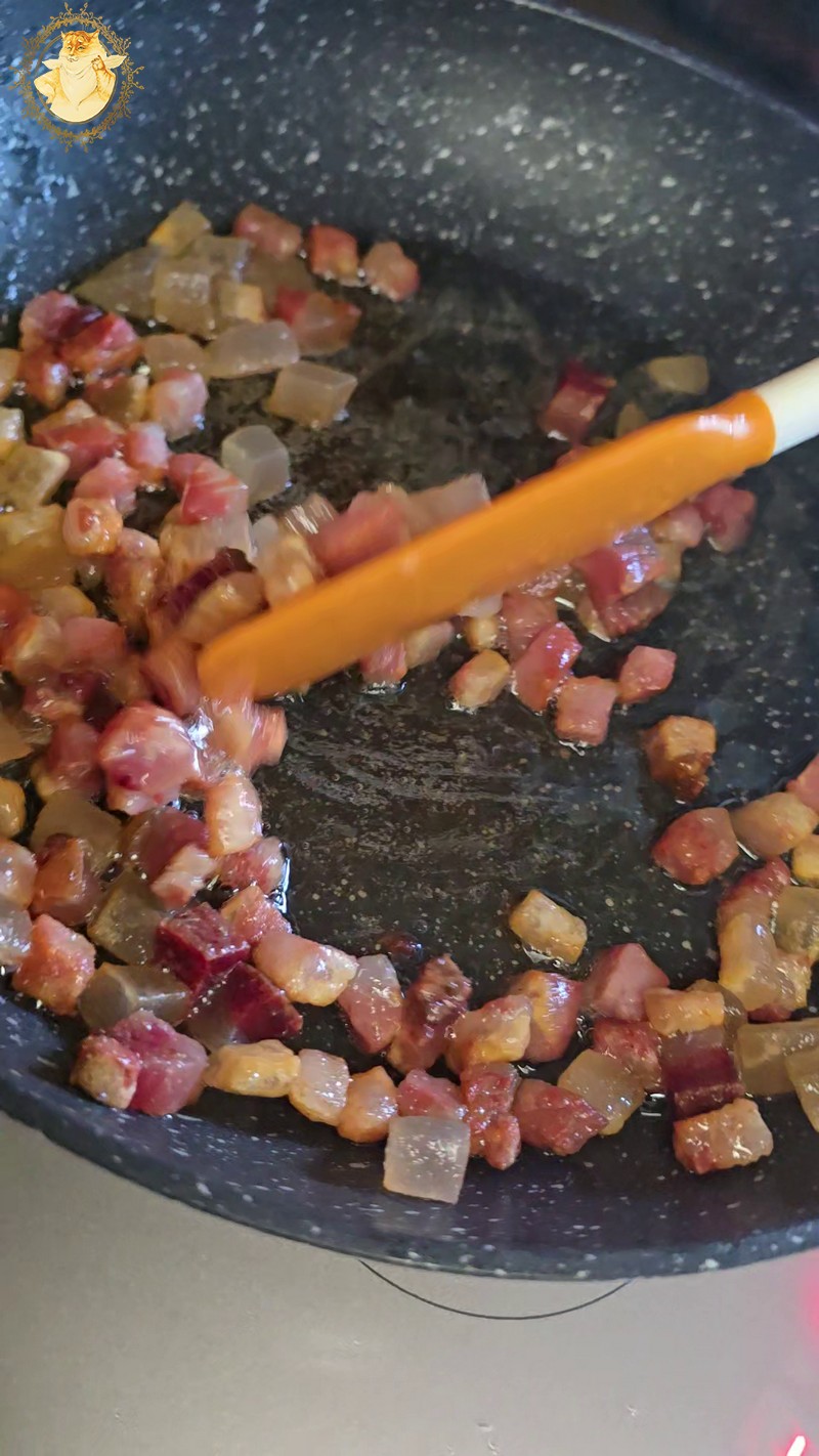 Supjaustę pakepinkite keptuvėje ant vidutinės ugnies, kol išsiskirs riebalai, o gabaliukai taps traškūs.