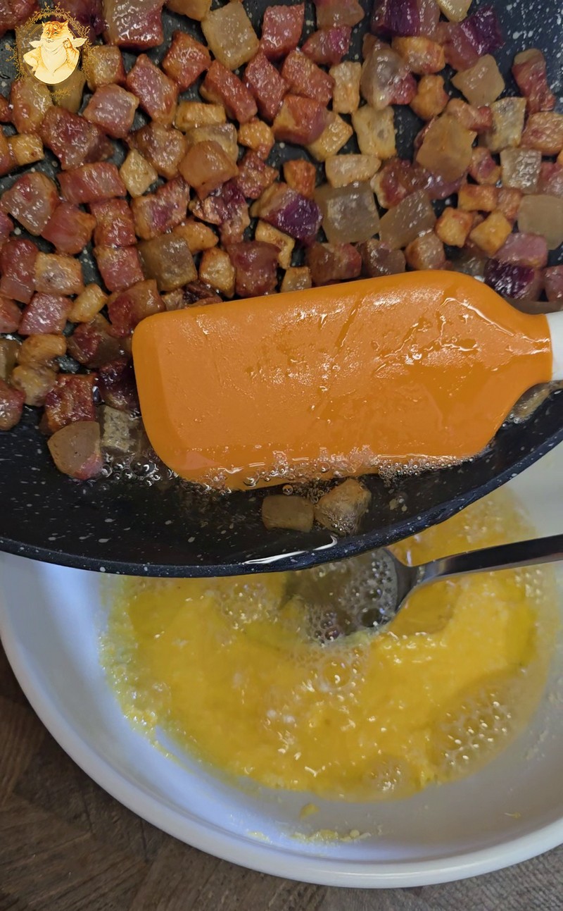 Kaitlentės kaitros stipriai nedidinkite – nes mes norime, kad riebalai išsiskirtų, o kubeliai tolygiai apskrustų, o nesudegtų.