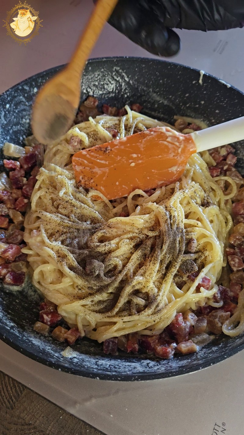 Ant kiaušinių suberkite sūrį, įberkite daug šviežiai maltų juodųjų pipirų ir gerai išmaišykite. Masė turi gautis kreminė, tada ant tos masės užpilkite šiek tiek ištirpusių taukų iš keptuvės, ir išmaišę įpilkite šiek tiek skysčio iš puodo, kuriame virė makaronai.