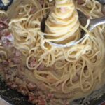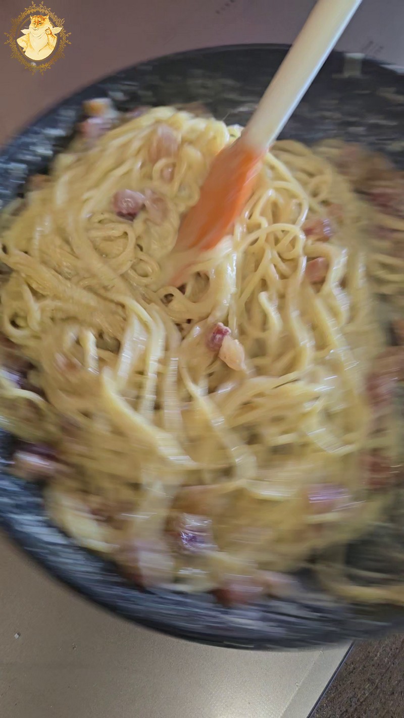 6. Supilkite kiaušinių ir sūrio masę, intensyviai maišykite, kad kiaušiniai susijungtų su karštais makaronais ir susidarytų kreminis padažas, bet ne kiaušinienė. Jei reikia – įpilkite šlakelį vandens kuriame virė makaronai, kad padažas gautųsi šilkinis.
