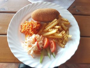 Į kavinę įžengėme 13:30, atrodytų pats pietų įkarštis. Deja, salėje, kuri prilygsta sporto salei, pietavo vos viena moteris ir ta, pasirodo, buvo kavinės virėja. Tad tuščia… Kadangi greitai prie mūsų prisistatė mergytė, padalino meniu ir jos veide įskaičiau viltį, kad užsakymas bus didelis, teko atsisakyti pirminio plano gerti kavą…. Vartant meniu, mano dėmesį patraukė kiaulienos šašlykas, o kompanionės – Kijevo kotletas. Aš buvau greitai padavėjos nuramintas, nes šašlyko tektų ilgai laukti, nes dar anksti ir niekas nekūrė židinio. Į klausimą: ką galite pasiūlyti iš kiaulienos išgirdau, kad vištienos kepsnys su grybais geras… Tokio atsakymo man užteko, kad pasirinkčiau irgi Kijevo kotletą…