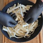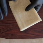 Tada į įkaitintą keptuvę su šlakeliu aliejaus dedame lavašą, tolygiai jį paskirstydami po visą keptuvės paviršių.