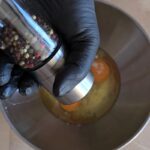Tada kiaušinius su pienu pagardinę druska ir pipiras gerai išplakame.