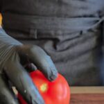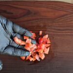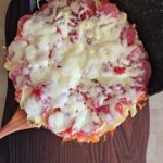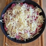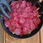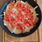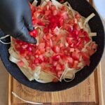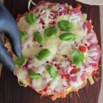 Ant viršaus sudedame smulkintą pomidorą ir papriką, paguldome gražiai dešryte, bet galima naudoti ir kitas dešrų rūšys, arba keptą vištieną.