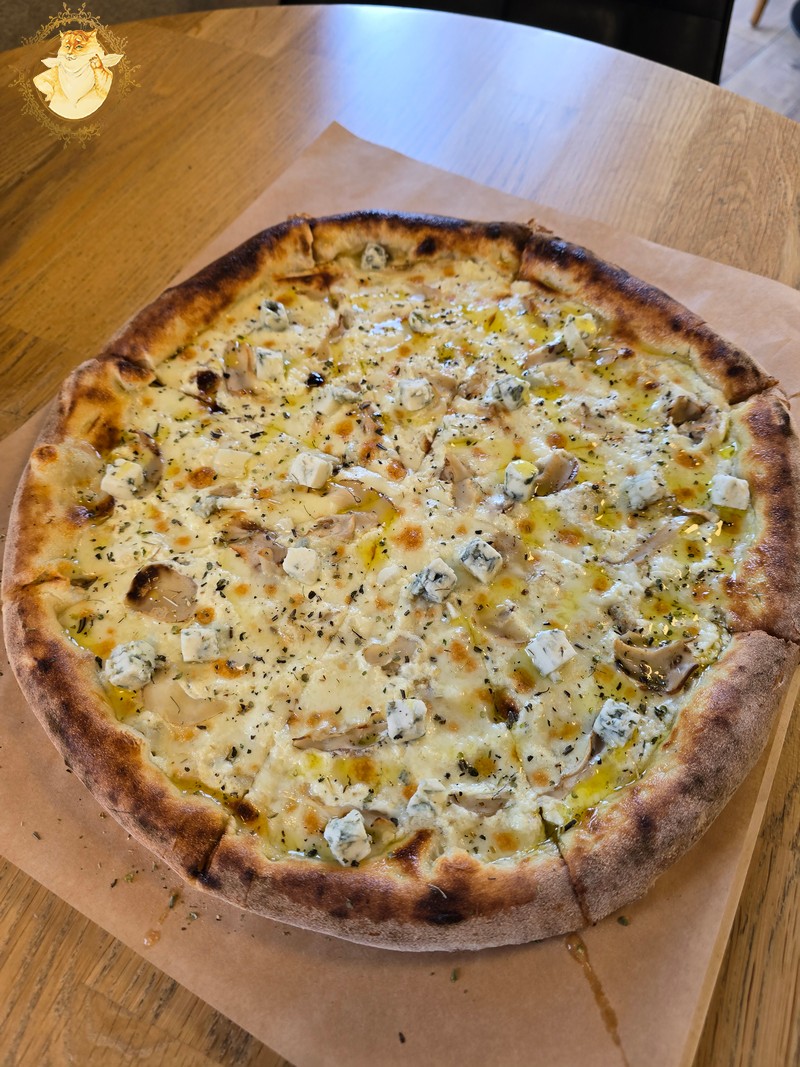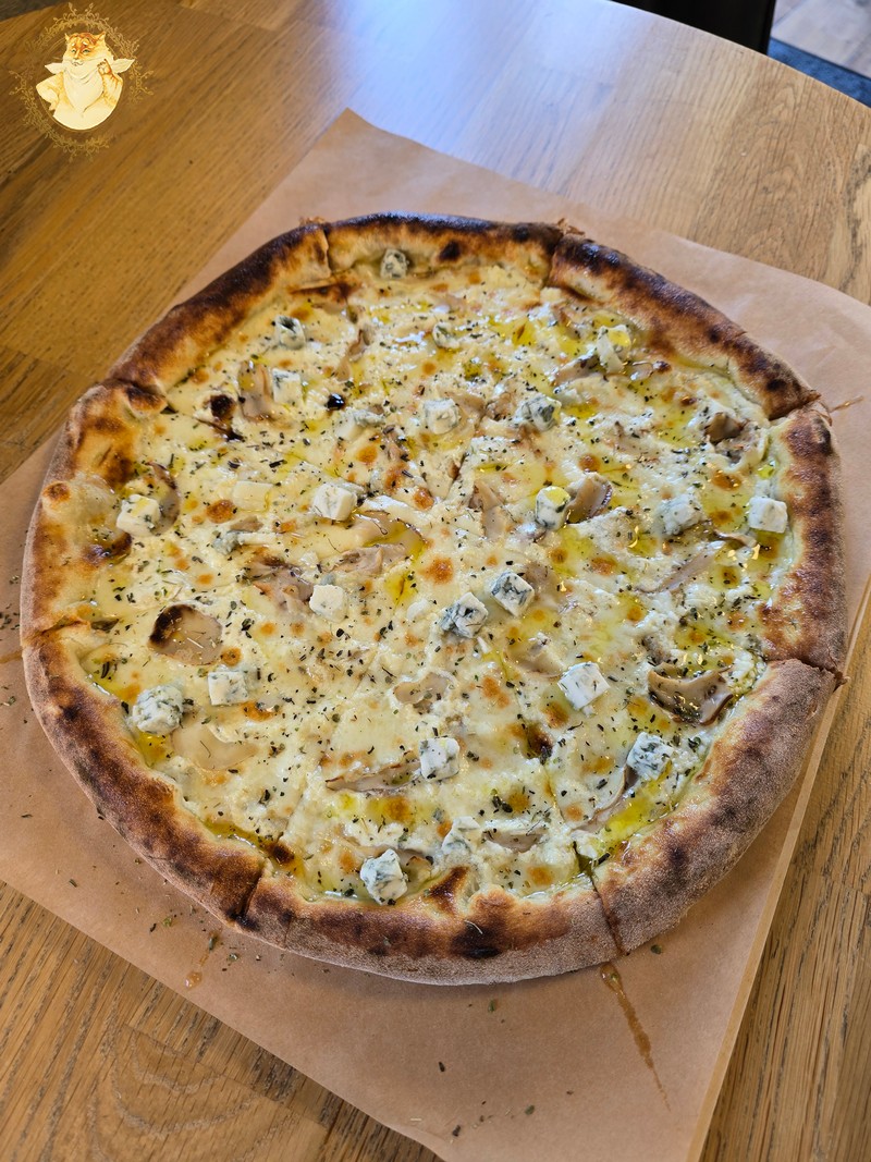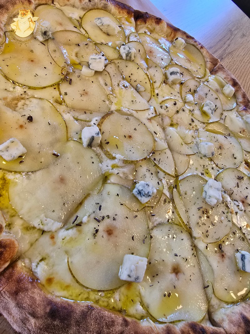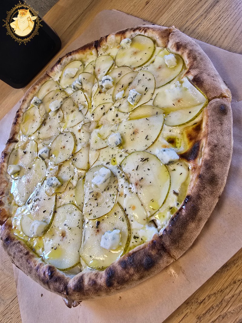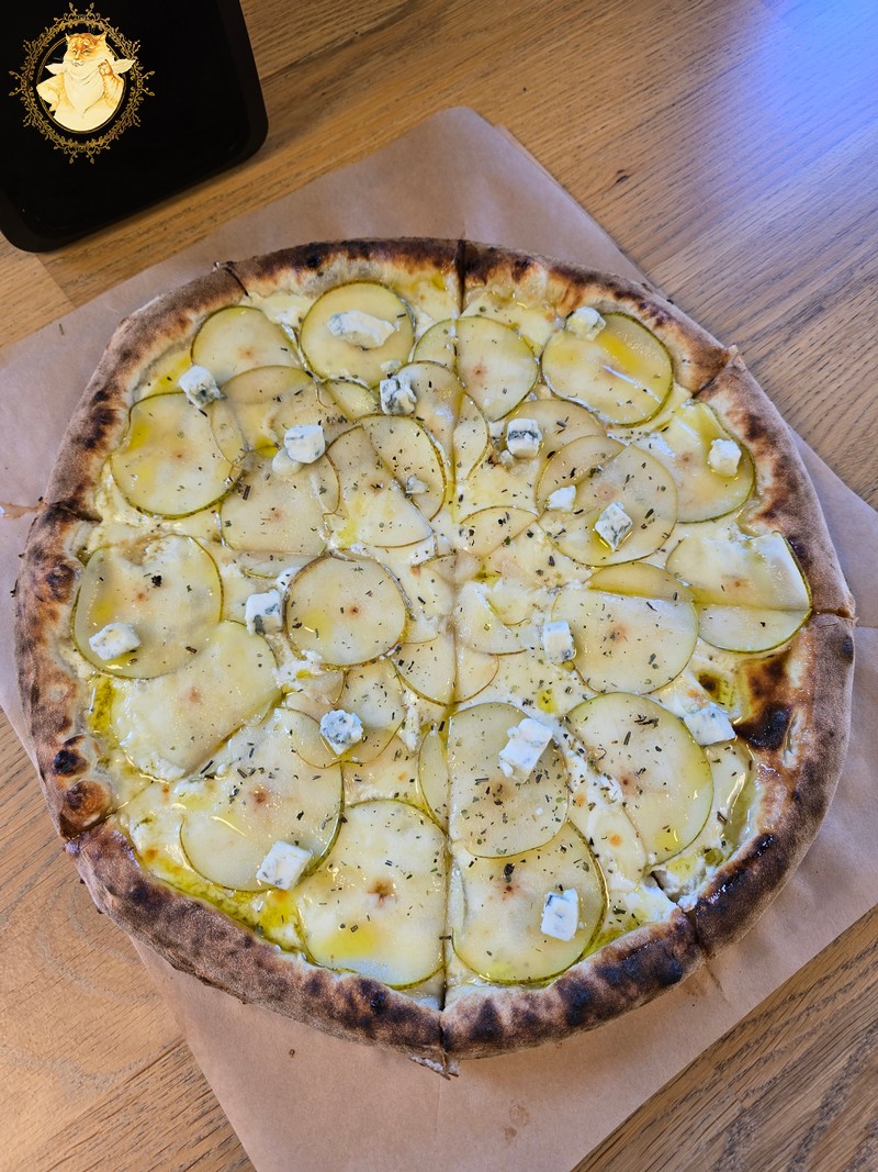 Nulėkęs prie prekystalio užsakiau dvi picas, viena iš dviejų buvo jau minėtas „Ožkos bučinys”, o kita desertui pica su kriaušėmis ir pelėsiniu sūriu.