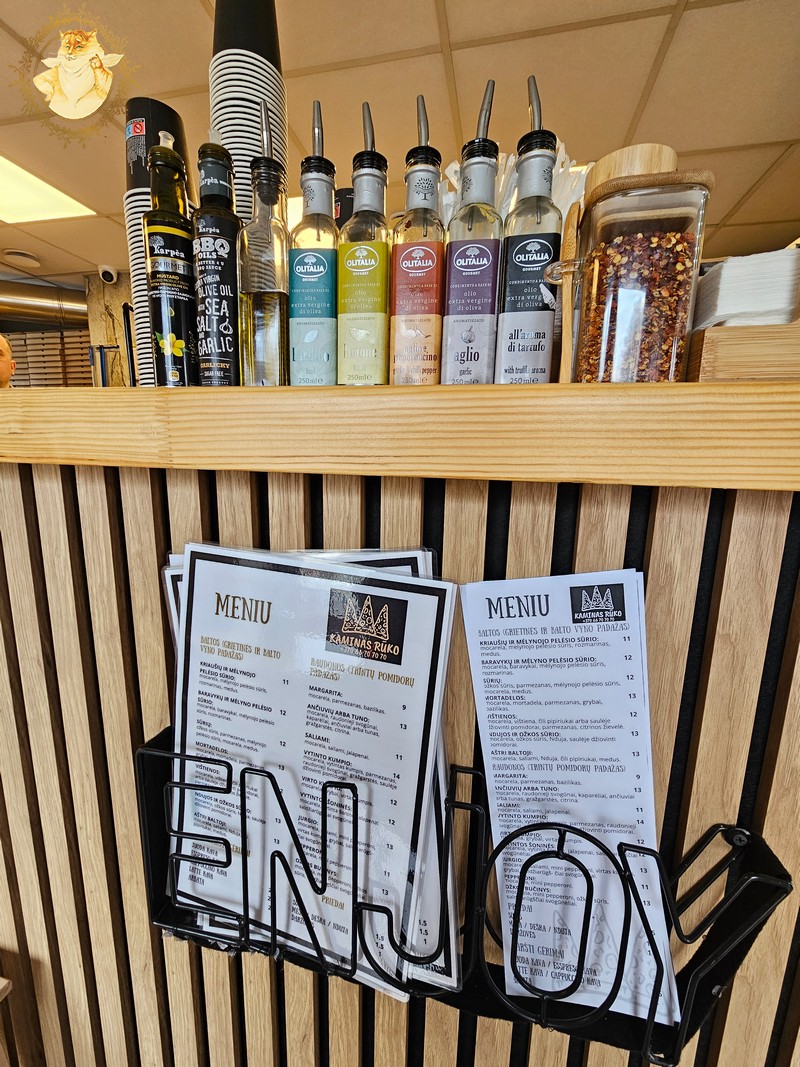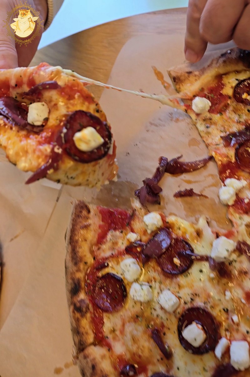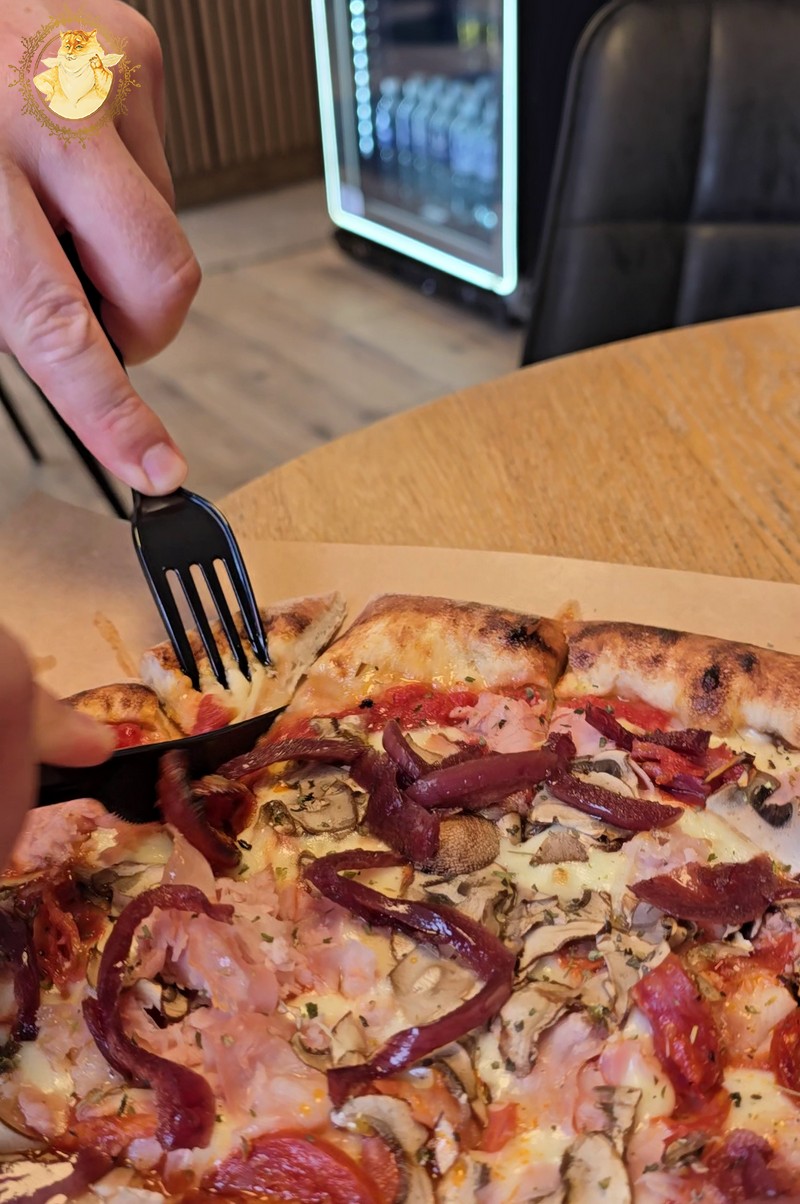 Panašaus plano laikėmės ir užsakydami picas, nors meniu surašyti šmaikštūs picų pavadinimai vos nepakoregavo mūsų užsakymo į jį įtraukiant dar vieną picą – „Ožkos bučinys”, bet deginantis nugarą Katinienės žvilgsnis privertė mane tos minties atsisakyti, ir pasitraukus nuo prekystalio prisėsti prie šeimos pasirinkto stalelio.