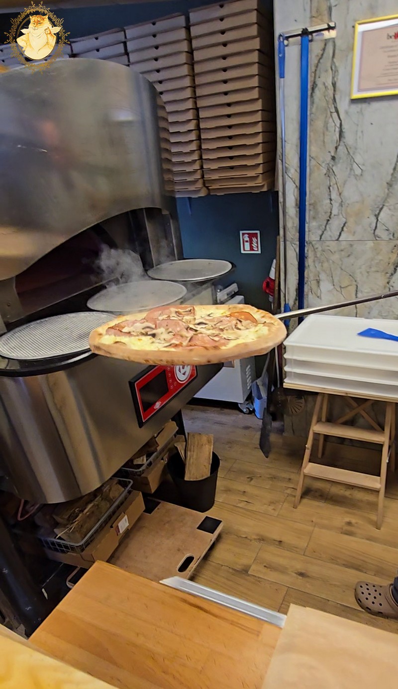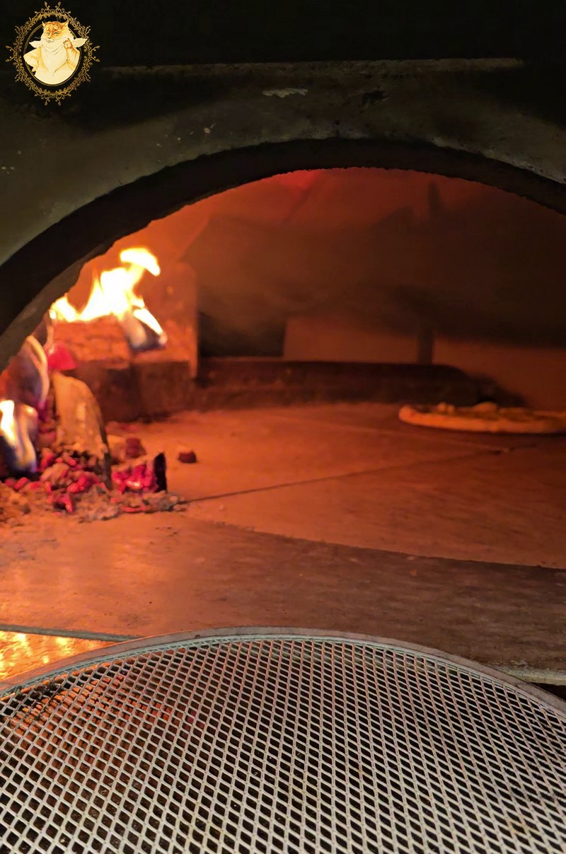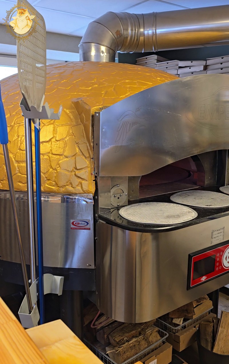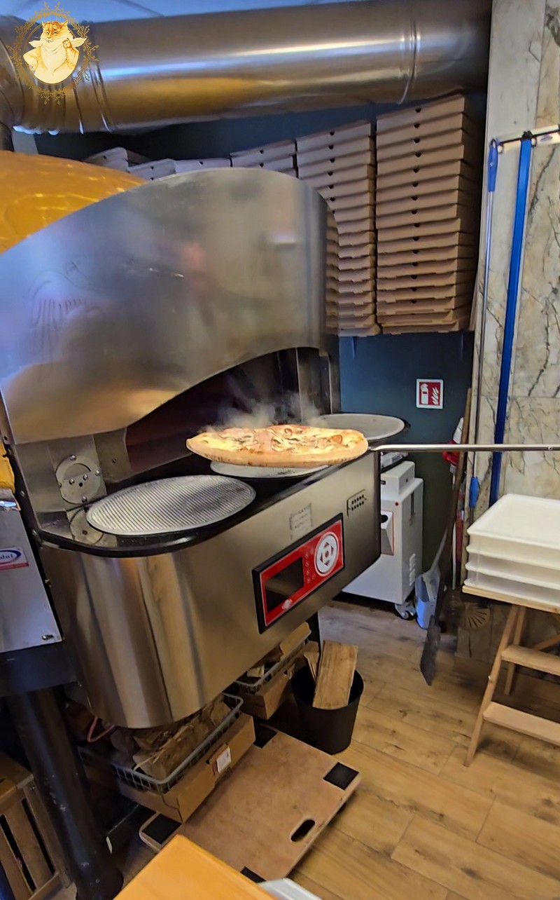 Malkinė krosnis picerijoje tokia didelė, kad dėl mažos picerijos patalpos nepajėgiau paveiksluodamas ją visą sutalpinti į kadrą.
