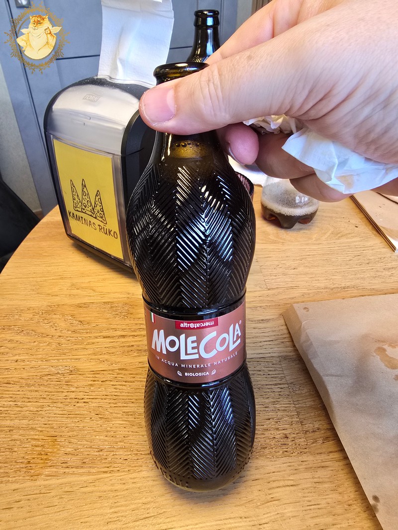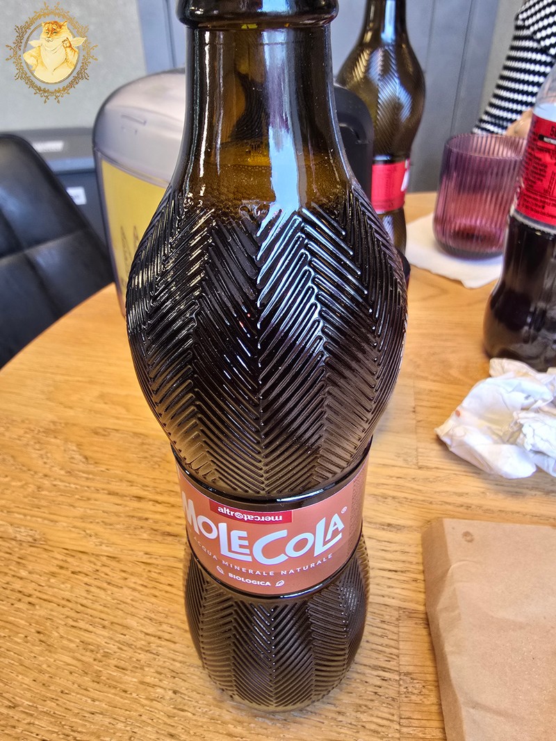 Jei „Kaminas rūko” darbuotojo pasakymas, kad „Mole cola” gaminama Italijoje, naudojant mineralinį vandenį, manęs nesugundė užsisakyti šio gėrimo, tai jo pasakymas, kad „Mole colą” prieš vežant į Lietuvą dar veža į Vatikaną, kur Popiežius asmeniškai visus buteliukus pašventintų, paliko mane ne tik be žado, bet ir sukėlė didelį norą kuo greičiau paragauti šio šventinto gėrimo.