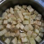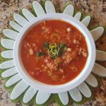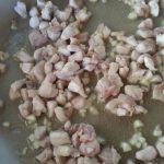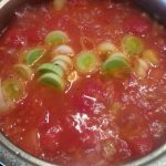Mums reikės: – 150g vištienos šlaunelių mėsos, – 1 indelio pomidorų savo sultyse, – 3 šviežių pomidorų, – 1 poro, – 1 morkos, – 0,5 svogūno, – 4 skiltelių česnako, – baklažano, – saujos ryžių.