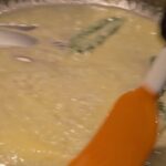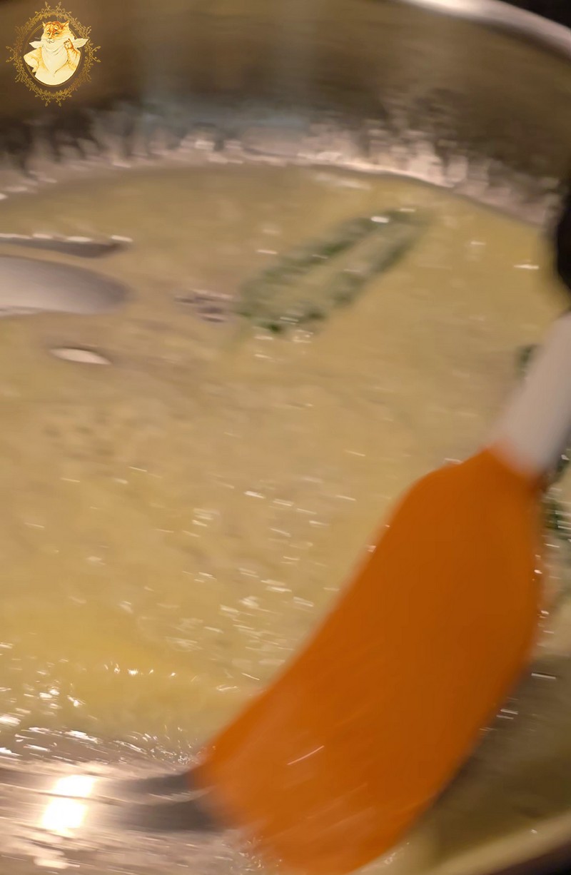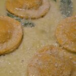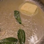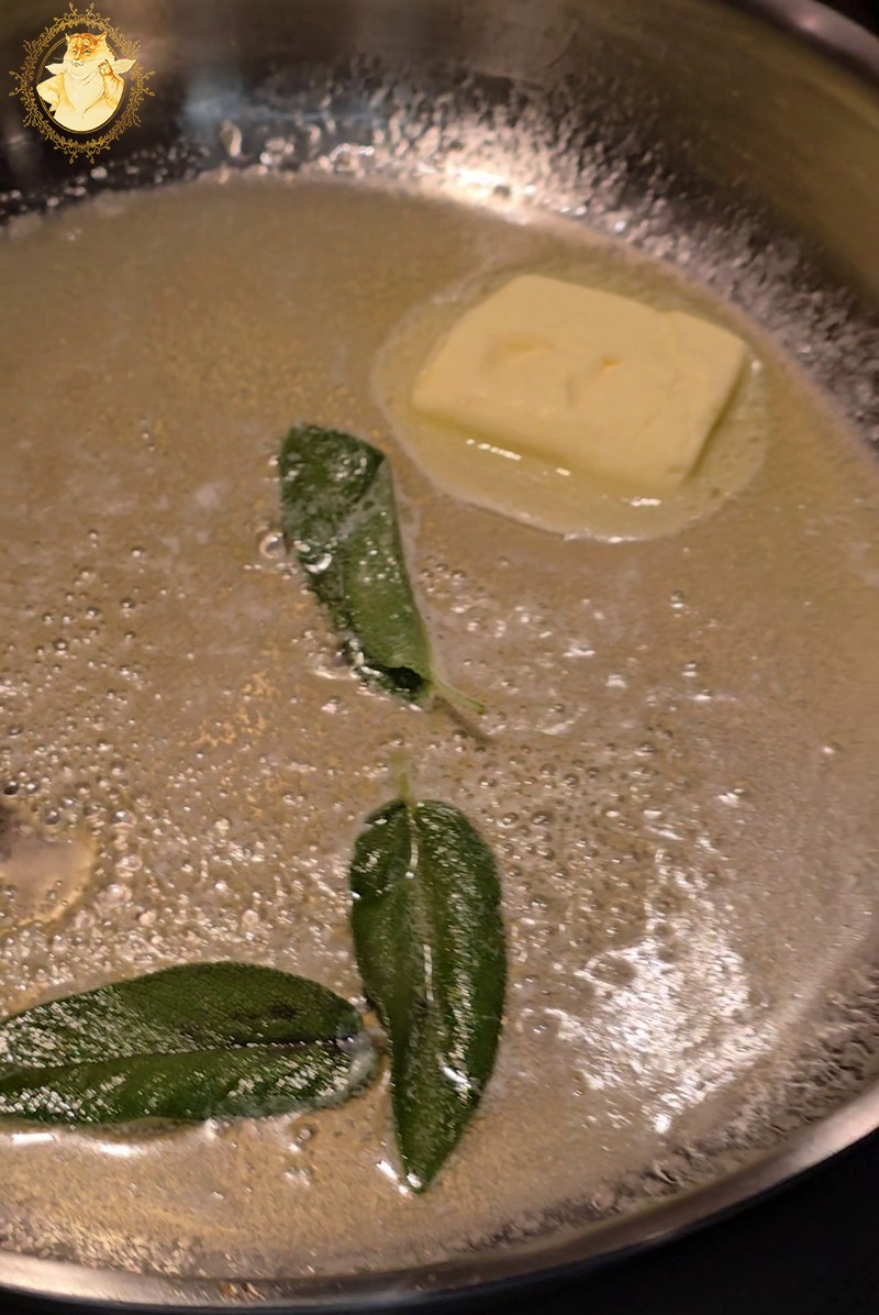 Ištirpiname keptuvėje sviestą, dedame šalavijo lapelių ir tarkuoto kietojo sūrio.