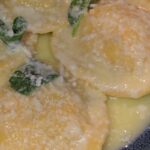 Sudėtus į lėkštę raviolius pagardinkite tarkuotu kietuoju sūriu ir smulkintu laiškiniu česnaku.