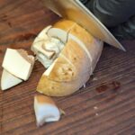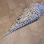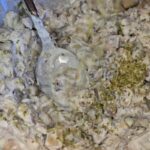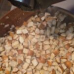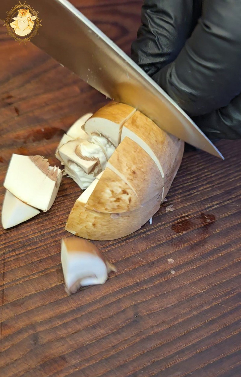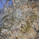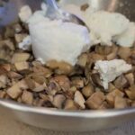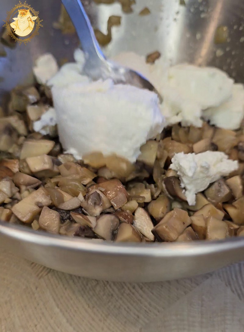 Atvėsusius grybus gardiname rikota ir viską gerai išmaišę pasigamintu turiniu prikemšame konditerinį maišelį.
