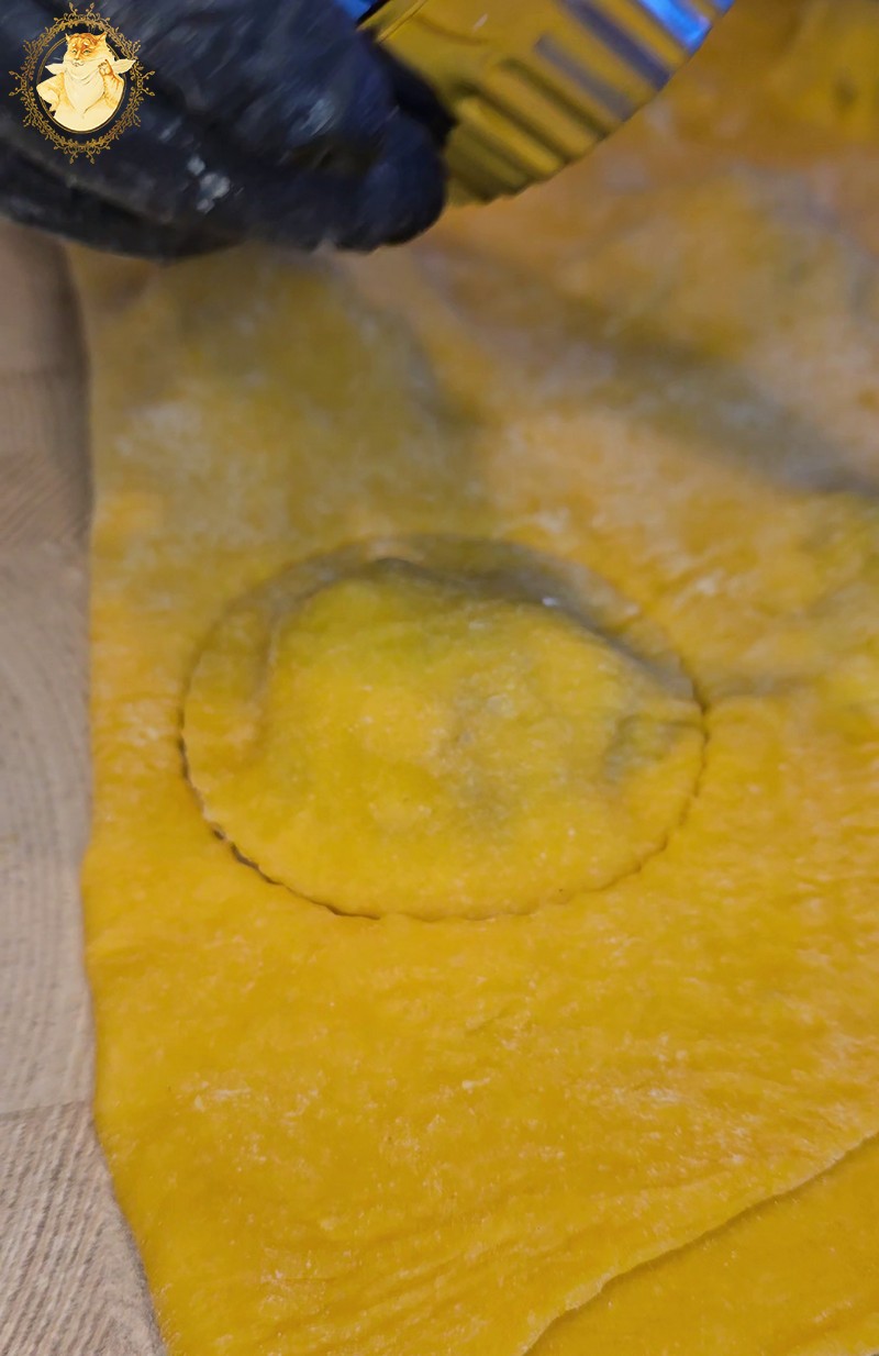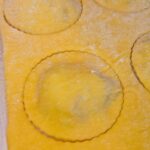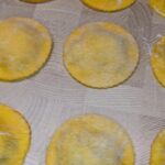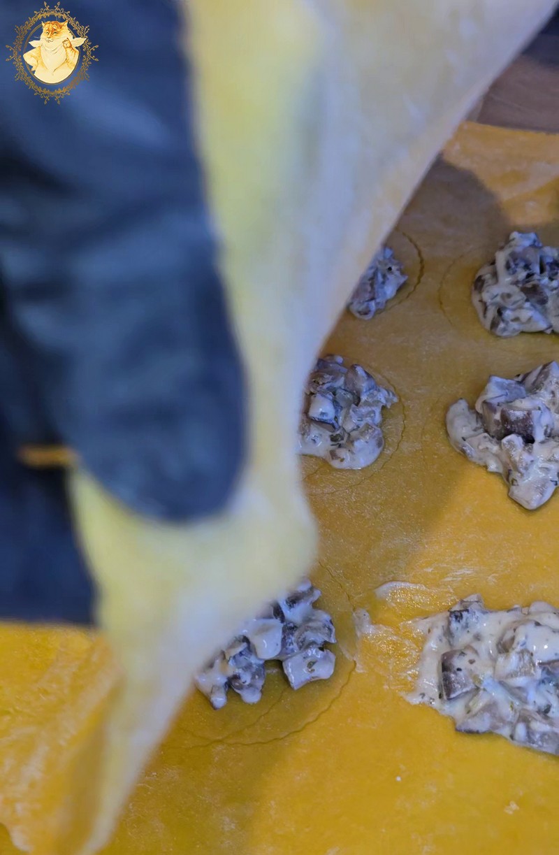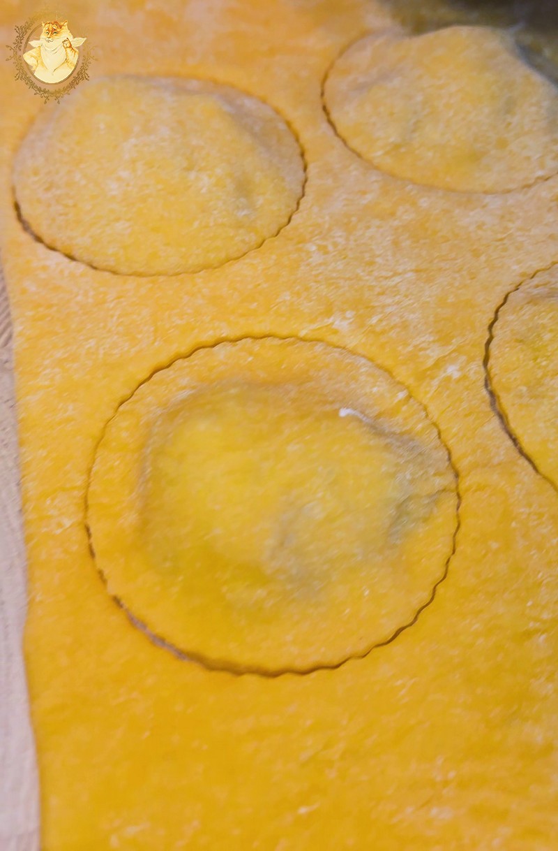 Tešlą pasistenkite iškočioti kuo plonesnę ir sudėję ant vienos tešlos pusės pagardo „kupstelius”, juos uždengę likusia tešla formuokite raviolius.