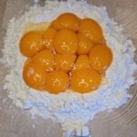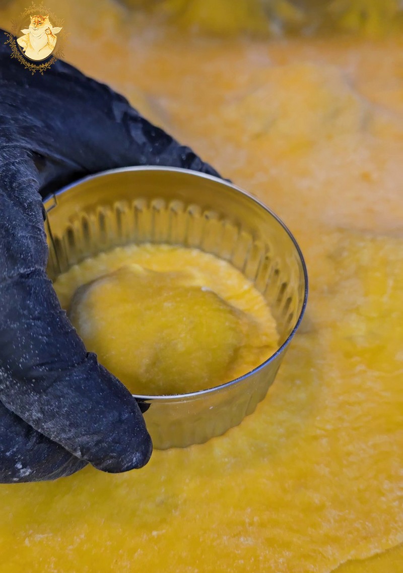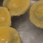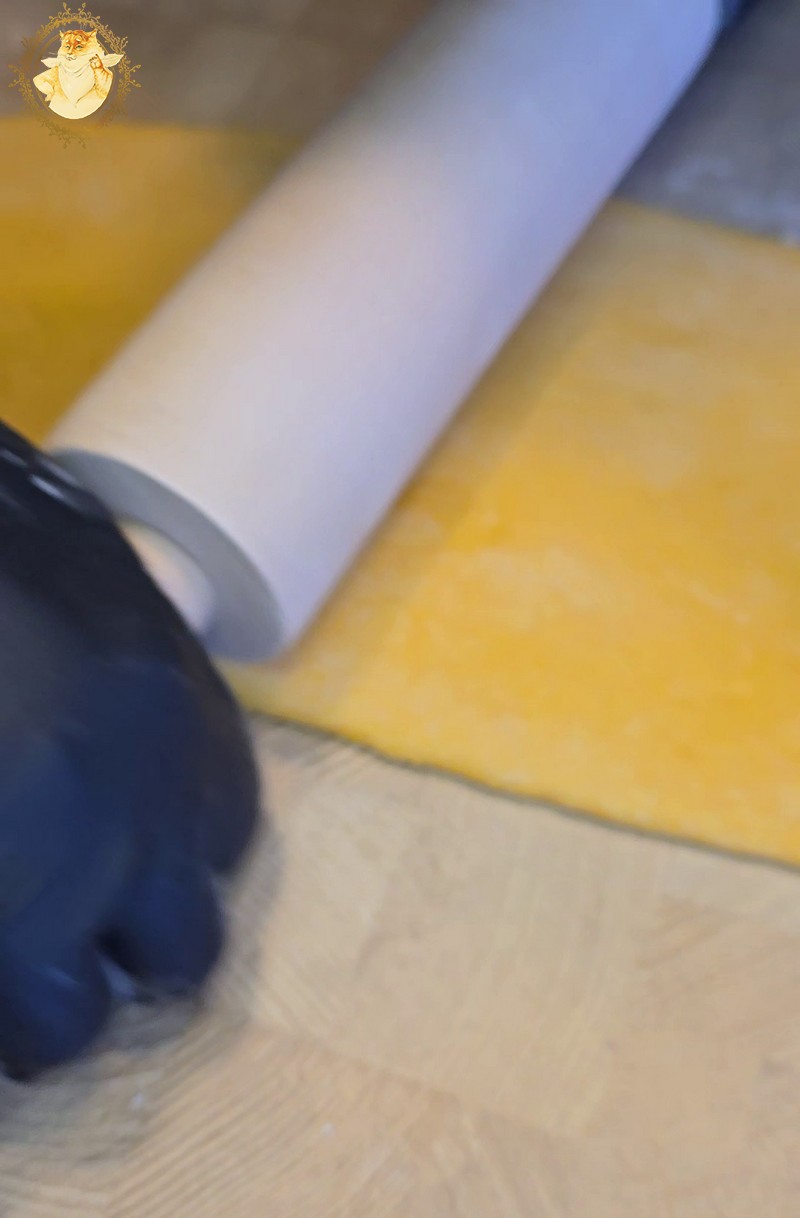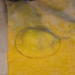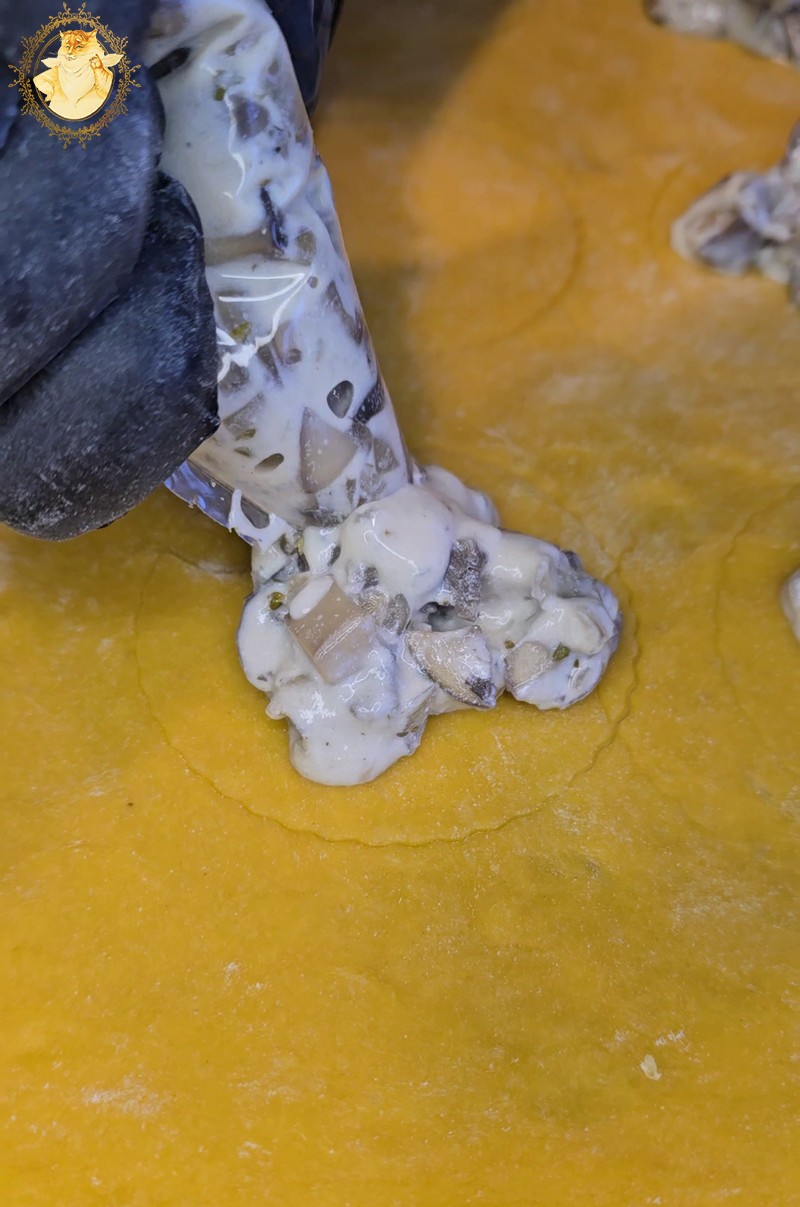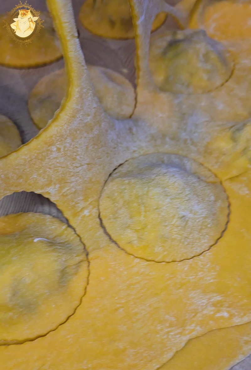 Tešlą pasistenkite iškočioti kuo plonesnę ir sudėję ant vienos tešlos pusės pagardo „kupstelius”, juos uždengę likusia tešla formuokite raviolius.